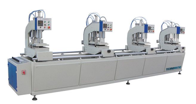 Автоматический четырехголовочный сварочник, термодинамический контроль температуры сварного зеркала, размер свариваемой заготовки 380-4400 мм, фиксированный сварной шов 3 мм, регулируемый угол сварки на головах от 30 - 180°, высокоэффективен для технологии вварки импоста в раму пластиковых окон и дверей