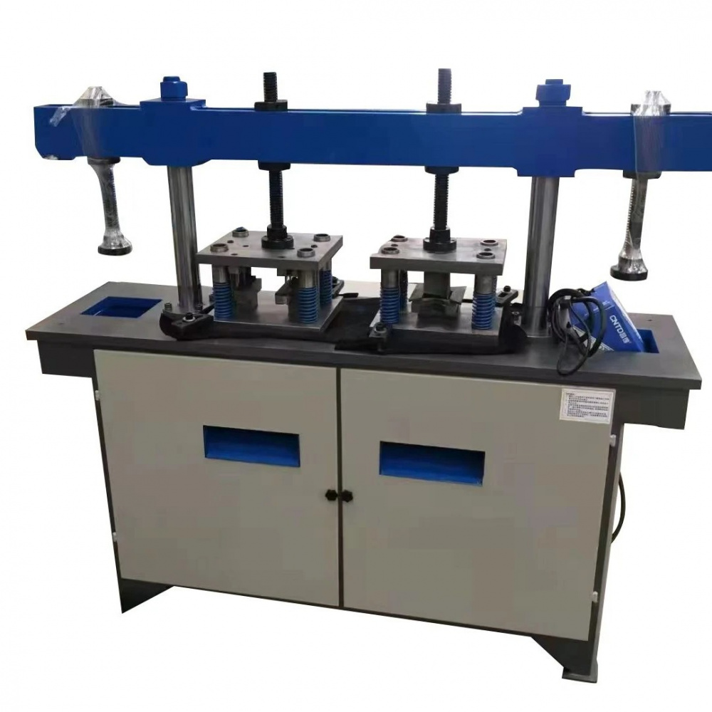 Рабочий стол представляет собой прочную стальную плиту с тремя прямоугольными прорезями и болтами по контуру площадок, которые необходимы для установки и фиксации матричных штампов для пробивки различных типоразмеров отверстий. Над столом сформирована вертикально подвижная на двух цилиндрах траверса, и на ней зафиксированы четыре регулируемых упора. То есть, основа матрицы крепится на рабочем столе, а ее верхняя часть толкается упорами траверсы вниз, когда последняя совершает вертикальное перемещение. Заказ пресс-формы или набора пресс-форм выполняется в качестве опции, при этом может быть изготовлена любая матрица в соответствие с запросом клиента.