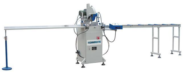Одноголовочный полуавтоматический дисковый отрезной станок, верхняя пневмоподача пильного диска, ручная регулировка угла реза 45 - 90 - 135 град, диск Ø 350 мм, возможность резки одного профиля сразу, размер заготовки устанавливается по указателю ограничителя и линейке на выходном рольганге, система охлаждения пильного диска для обработки алюминиевых профилей, входной и выходной рольганги для поддержания профиля.