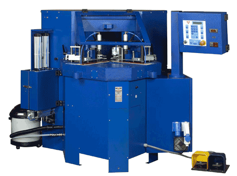 Станок предназначен для сборки угловых соединений оконных и дверных рам из алюминиевого профиля методом опрессовки соединяемых элементов рамы на предварительно установленном угловом сухаре.