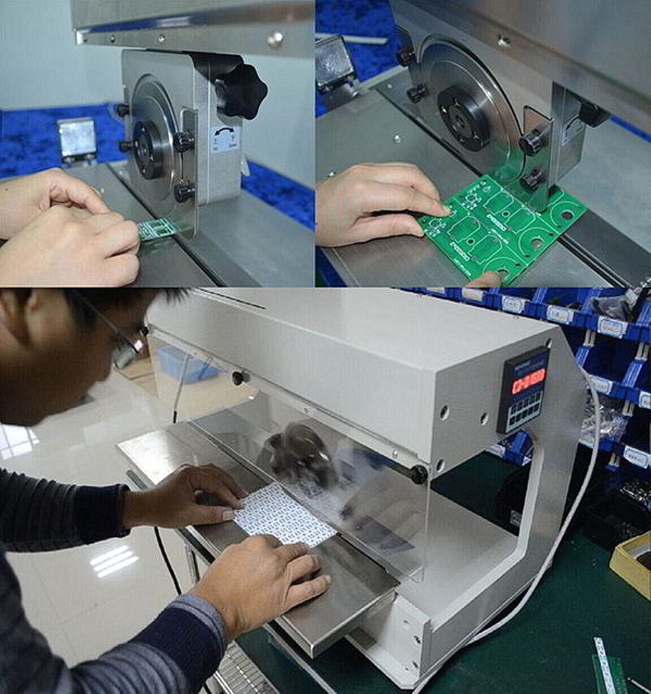 Принцип действия: плата, располагается на лезвии нижнего ножа по линии скрайбирования, после опускания дискового ножа, заготовка разрезается. Станок ASC-508 разрезает печатные платы движущимся лезвием, что может уменьшить внутреннее напряжение, возникающее во время сдвига, и избежать трещин в местах припоя и разрушения компонентов. ASC-508 использует круглое лезвие (вверху) и ленточное лезвие (внизу).