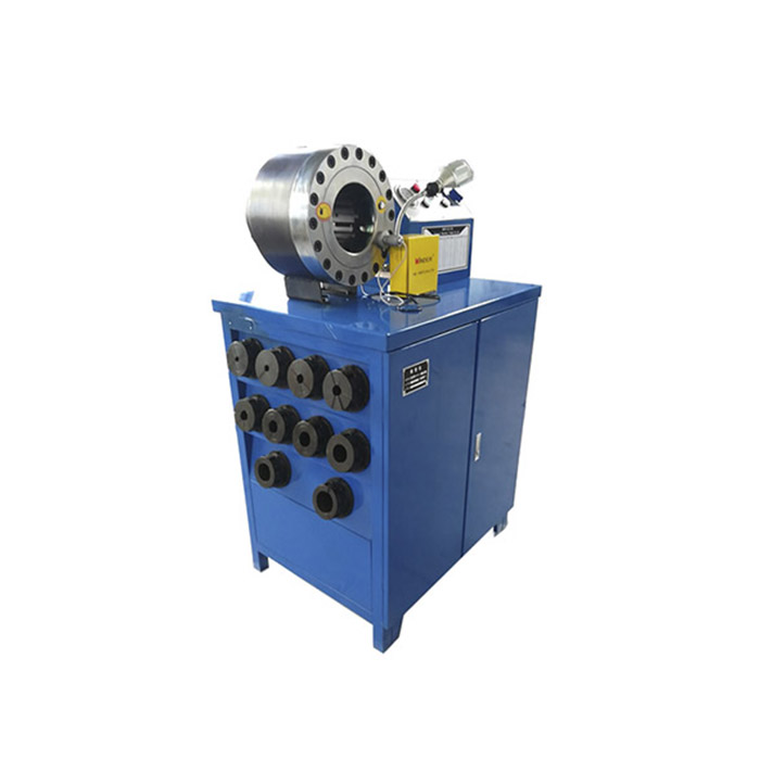 Устройство для обжима шлангов высокого давления DSG250-1 понятное в эксплуатации и обслуживании. Внешне изделие выполнено, как тумба, на рабочем столе которой слева обжимное кольцо, справа – щиток с аппаратурой и пультом управления. Имеется 13 наборов стандартных штампов, и эти различные размеры штампов делают обжимной станок для шлангов универсальным оборудованием. Запасные матрицы удобно хранятся на боковой стенке тумбы. Операционная зона подсвечивается с помощью светодиодной лампы на гибкой ножке.