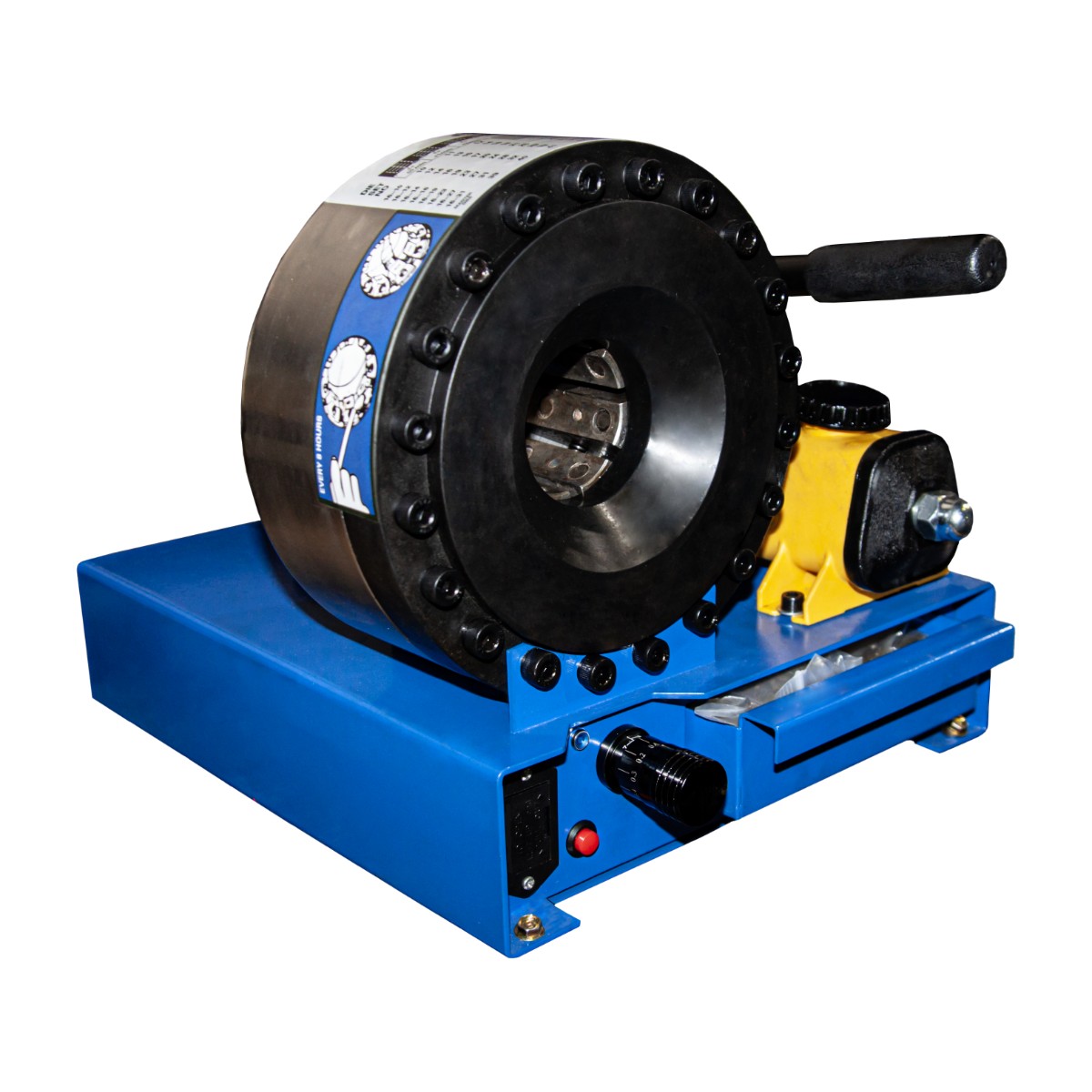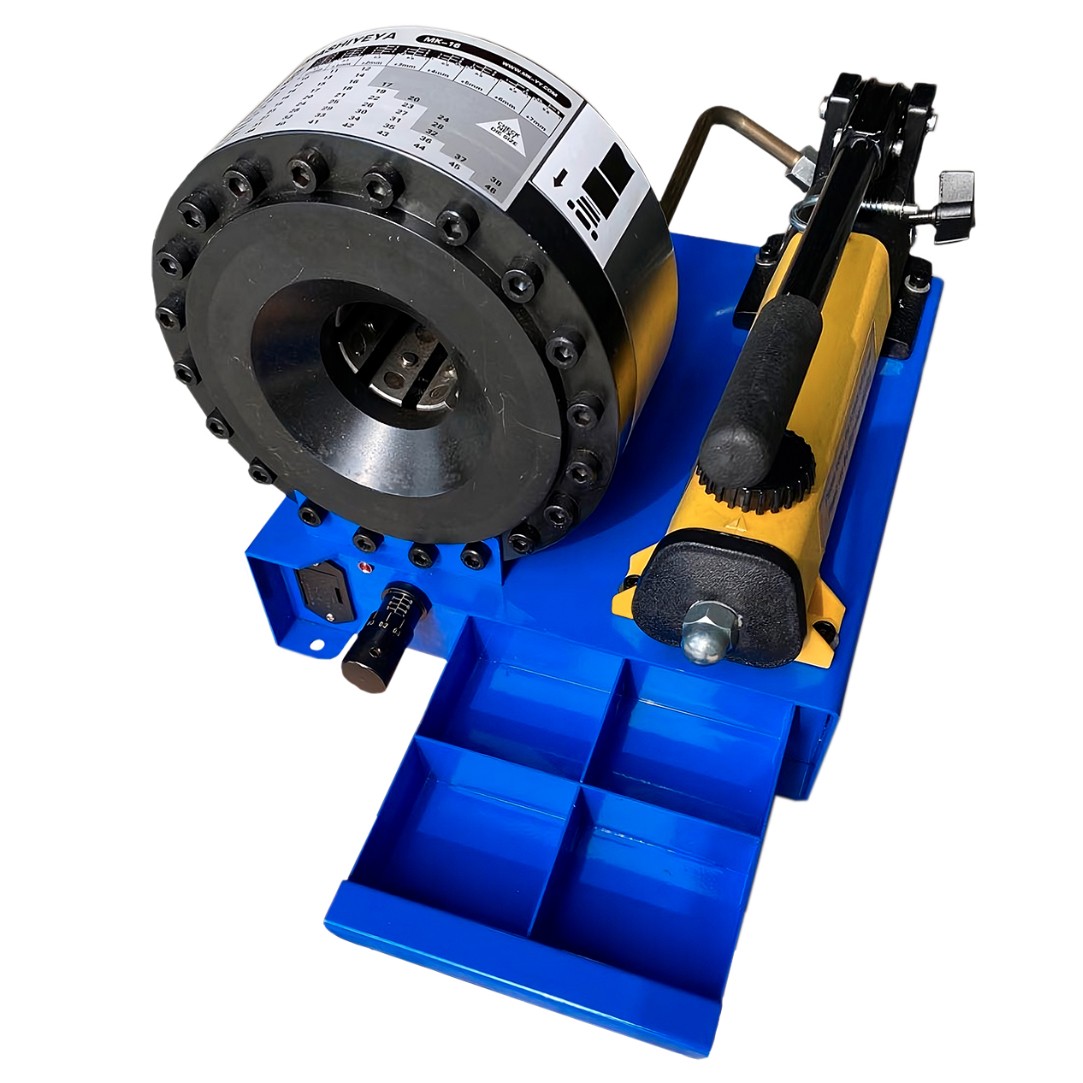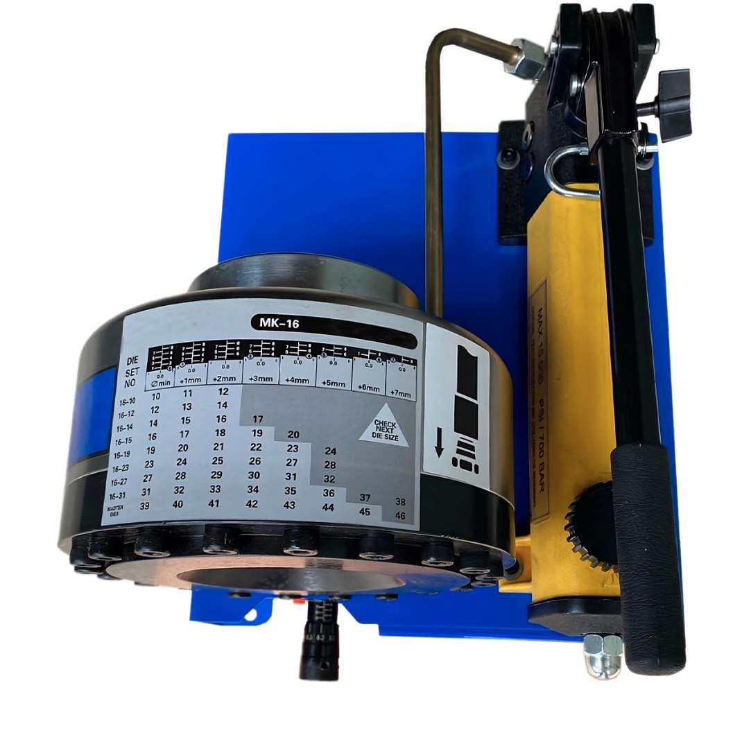 Ручной обжимной пресс РВД MK-16 с гидравлическим приводом компактный, но имеет необходимую мощность. Добавление гидравлической мощности даёт техническому специалисту более быстрый и мощный метод обжима концов шлангов. Цанга представляет собой кольцевой гидравлический цилиндр. Сила, создаваемая цилиндром, толкает составные части матрицы, заставляя их сжиматься на конце шланга с большим усилием.