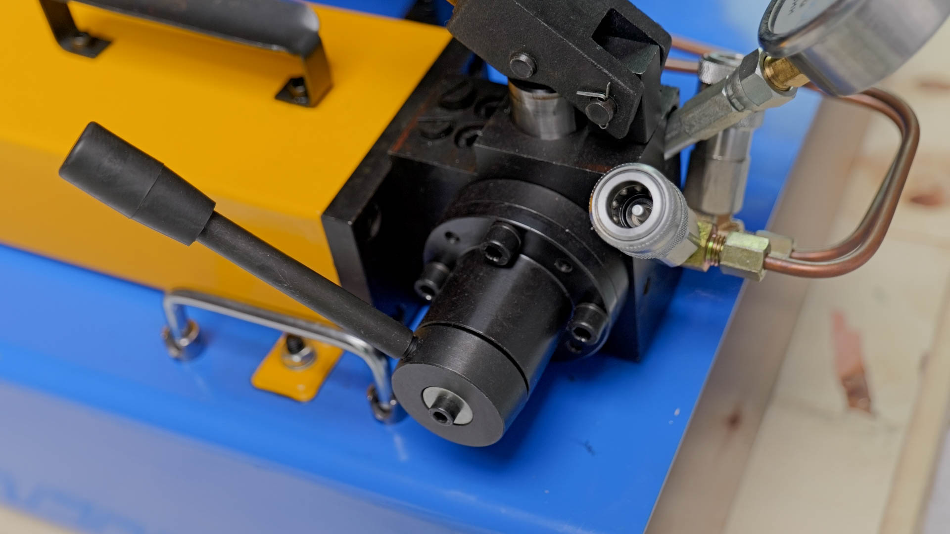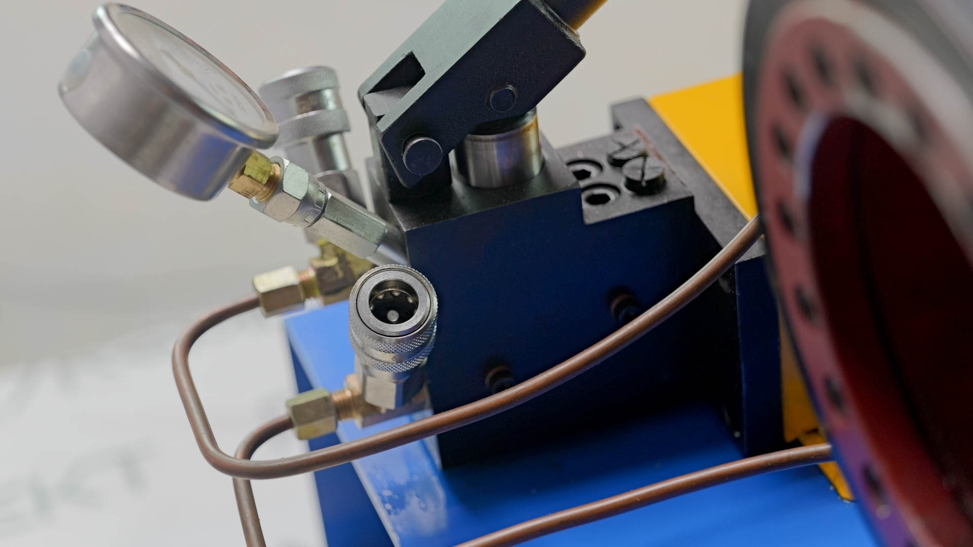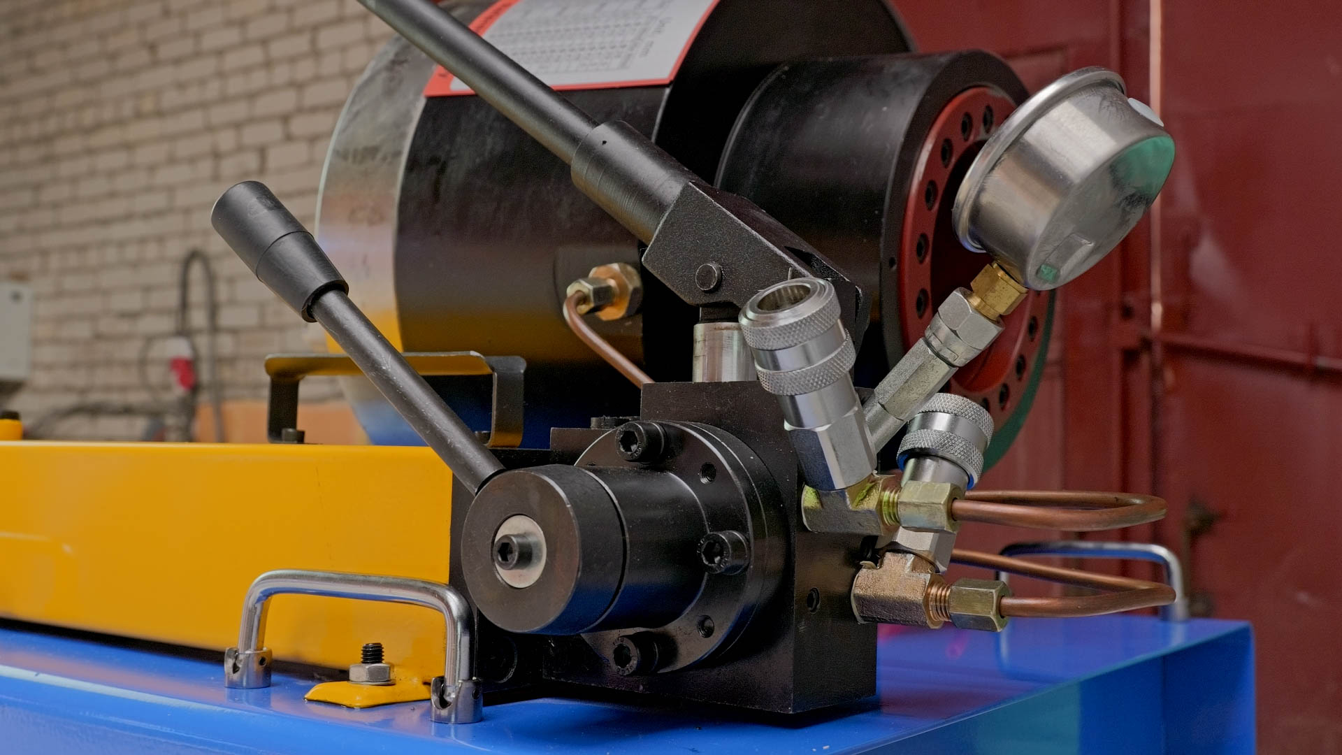 Рабочая скорость модели составляет порядка 18 секунд, на размыкание пресс-шайбы тратится не более 6 секунд. Устройство имеет производительный насос, который способен перекачивать до 10 л в минуту, для работы используется гидравлическое масло. Станок отличается компактными габаритами, его можно использовать как мобильное оборудование для опрессовки. Модель оснащена баком на 20 л, имеет скромные габариты и сравнительно небольшой вес (150 кг без учета рабочих жидкостей). Этот станок широко используется в сфере обслуживания строительной спецтехники, оборудования для добычи полезных ископаемых и в других отраслях, где требуется обжим РВД.