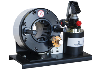 Ручной, переносной пресс с радиальным обжимом NEOTECH NKH-25, оптимальное устройство для обжима гидравлических рукавов высокого давления маленьких и средних размеров. Пресс NEOTECH NKH-25 специально разработан для ремонта и технического обслуживания техники в небольших или мобильных мастерских. Пресс не нуждается в электропитании, имеет небольшой вес, высокую надежность и коррозийную стойкость. Ручной двухуровневый насос пресса NKH-25 позволяет достичь силы сжатия до 137 тонн (1350kN). Этого усилия достаточно для опрессовки большинства видов термопластиковых, резиновых, тефлоновых и других шлангов с внутренним диаметром до 1 1/2 дюйма. Настройка диаметра обжима производиться с помощью микрометра на котором выставляется необходимые для работы значения. (Для получения нужного диаметра обжима устанавливается подходящий комплект "кулачков" (номер "кулачка" – это диаметр при сомкнутых кулачках) на микрометре необходимо выставить значение равное разнице между параметром обжима и номером "кулачка"). При достижении заданного параметра подается световой и звуковой сигнал.