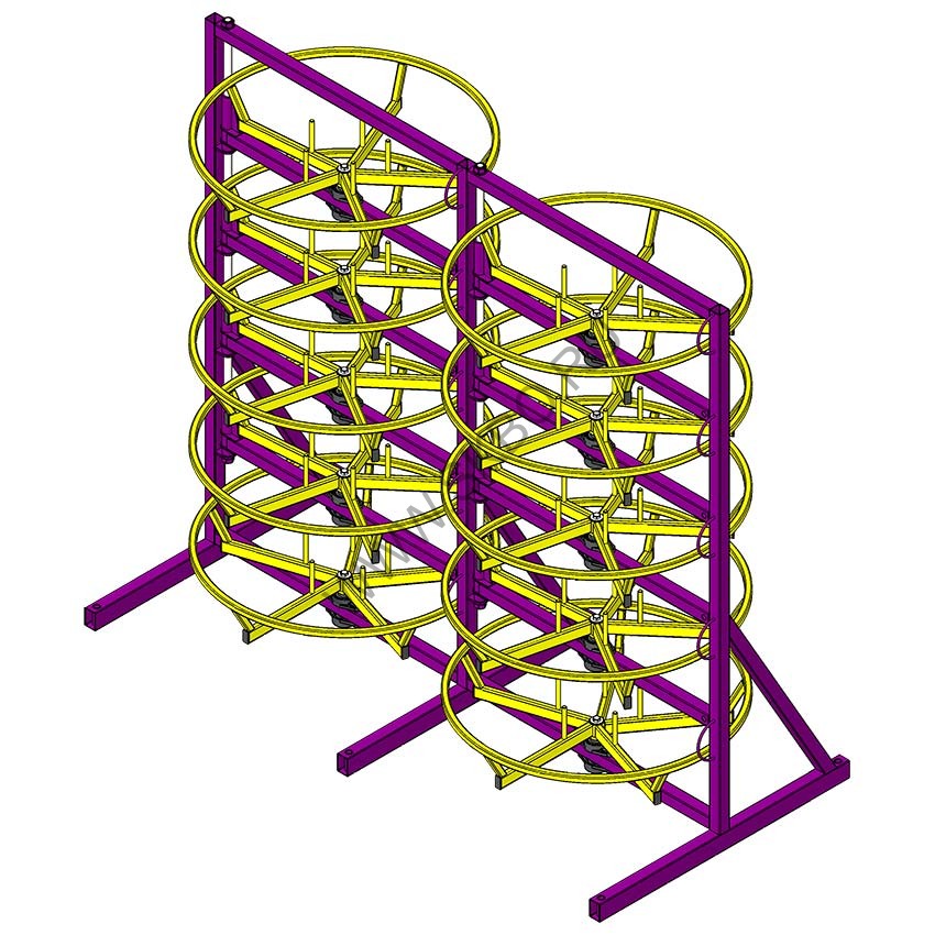 Для удобства перевозки, стеллаж выполняется с разборной конструкцией и поставляется двумя местами в одном упакованы технологические барабаны, в другом - элементы рамы. При необходимости, стеллаж может устанавливаться на колёсные опоры.