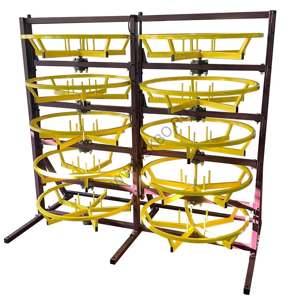 Cтеллаж СБРВД 2-5-0,85 - разборная стойка для хранения и размотки бухт рукавов высокого давления наружным диаметром до 850 мм на пяти ярусах. На каждом ярусе в два ряда на выдвигающихся независимо друг от друга балках установлены технологические барабаны, на которые помещаются бухты шланга или РВД. Технологический барабан выполнен в форме корзины для того, чтобы исключить возможность самопроизвольного разматывания и спадания крайних витков бухты.