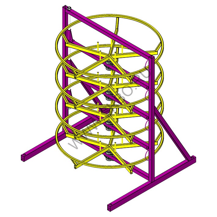Стеллаж для бухт СБРВД 4-1, СБРВД 5-1, СБРВД 6-1, СБРВД 7-1 - стойка, предназначенная для хранения бухт резиновых шлангов для изготовления рукавов высокого давления РВД. Бухты резиновых шлангов хранятся во вращающихся корзинах, установленных на ярусах стеллажа в одной вертикальной плоскости. Для удобства закладки и выемки бухт шланга каждый ярус с корзиной может выдвигаться из плоскости хранения стеллажа.