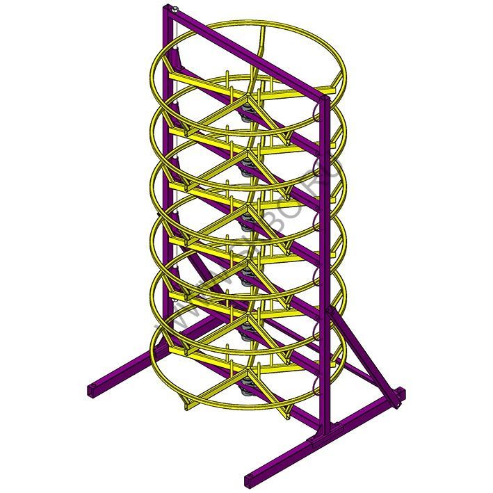 Стеллаж СБРВД 6-1Р - разборная стойка для хранения и размотки бухт шлангов рукавов высокого давления, гофрированных кабель-каналов и прочих упругих длинномерных материалов на шести выдвижных ярусах. Для загрузки технологического барабана ярус выдвигается из плоскости стеллажа, затем ярус с установленной бухтой возвращается в плоскость и фиксируется защёлкой. Стеллаж производится в фиолетово-жёлтом и серо-красном исполнении.