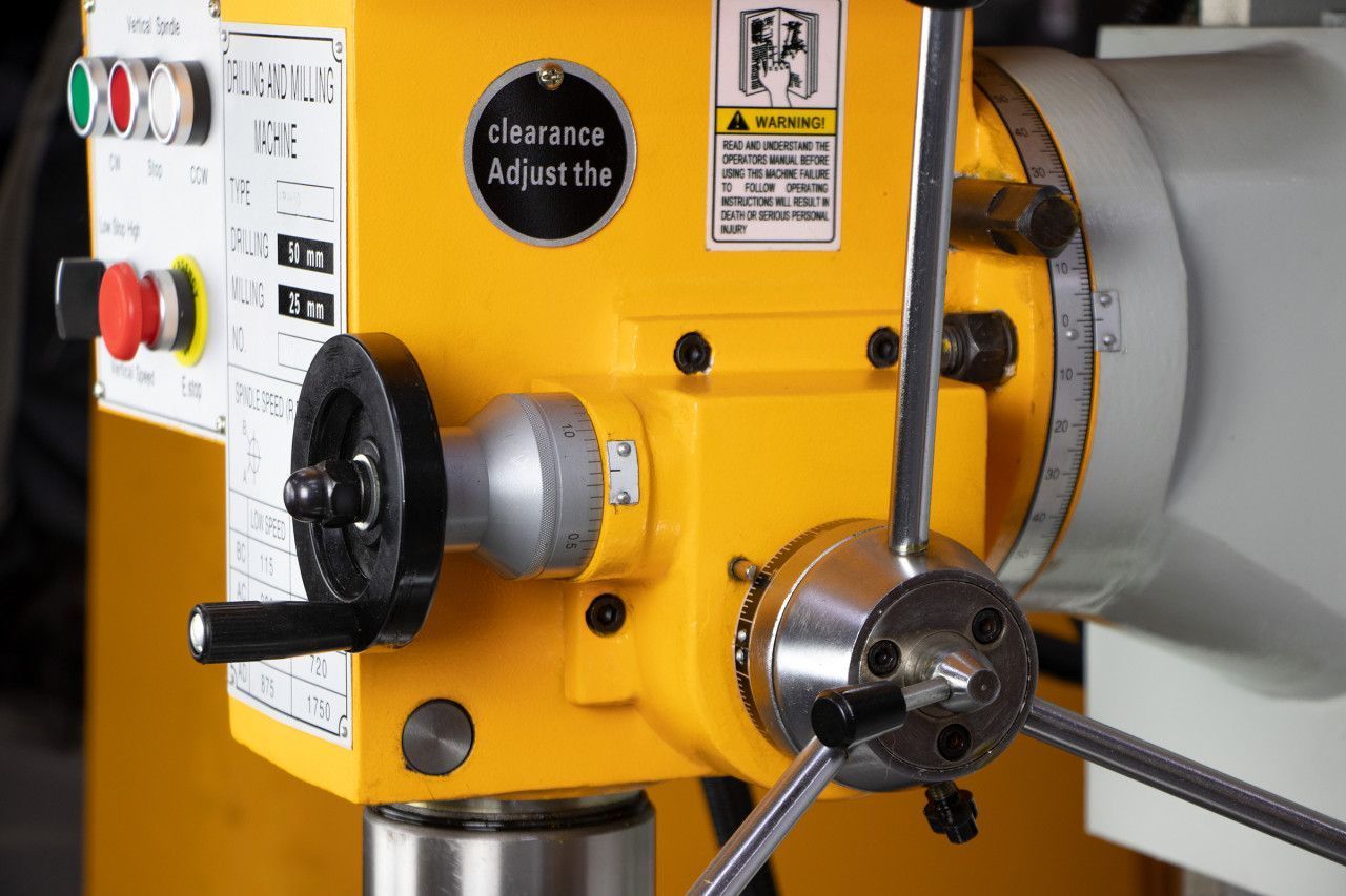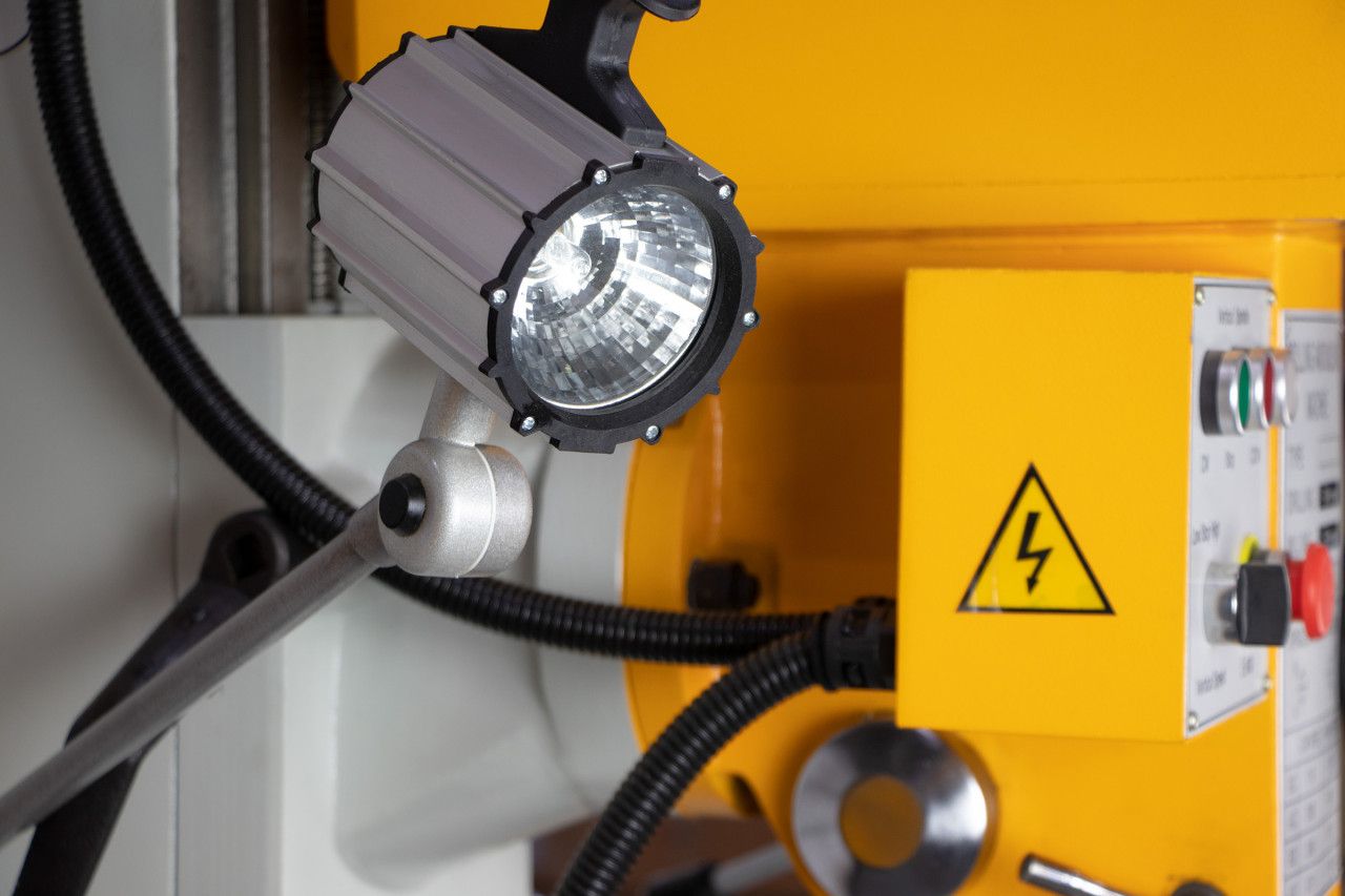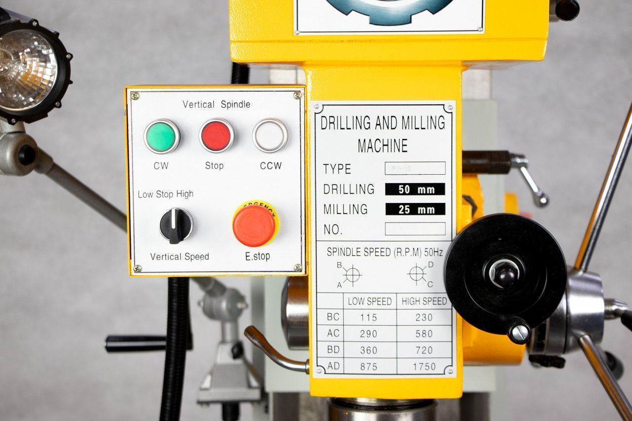 Устройство оснащено мощным электрическим двигателем. Питается от сети с трехфазным током 380 В. Число оборотов шпинделя изменяться в пределах от 115 до 1750 об/мин (8 положений), за счет чего можно выбрать наиболее подходящую частоту вращения. Оборудование снабжено лампой, которая обеспечивает освещение рабочей зоны.