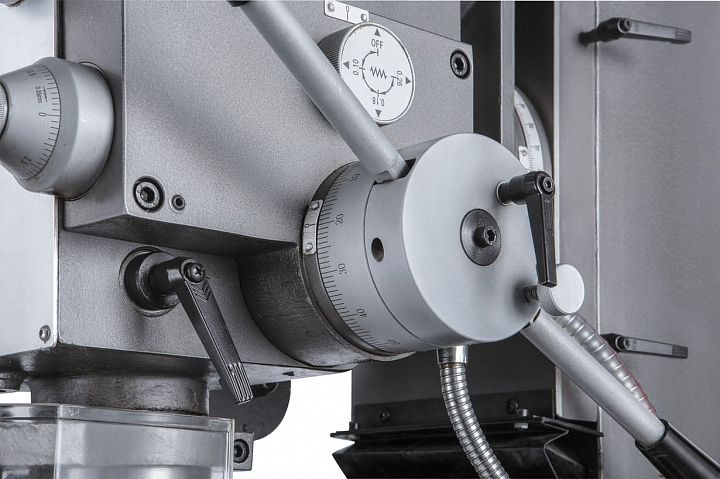 В зависимости от обрабатываемого материала и необходимых режимов обработки, можно выбрать любую из 12 скоростей вращения шпинделя в 2-х диапазонах от 75 до 1600 об/мин и от 150 до 3200 об/мин. Для расширения диапазона обрабатываемых деталей фрезерная голова имеет возможность наклона вправо/влево на 90 градусов.