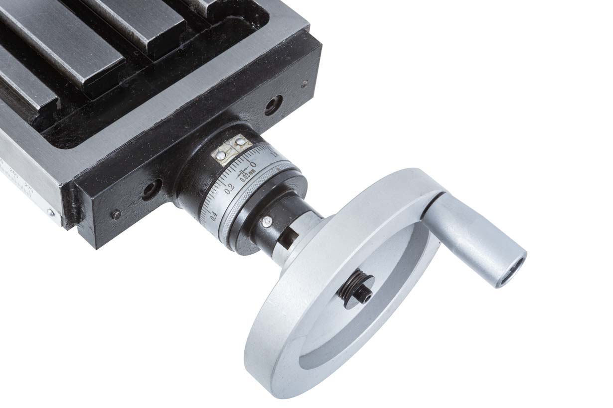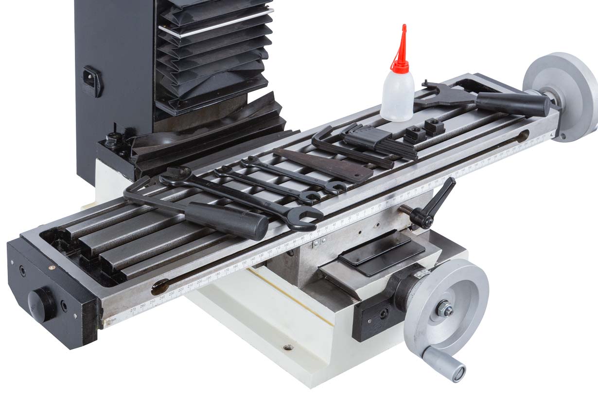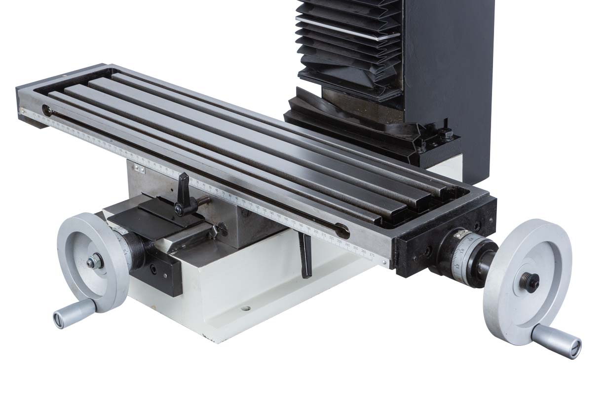 Крестовый рабочий стол размером 595 x140мм перемещается по направляющим скольжения типа ласточкин хвост. Закрепление тисков и других зажимных приспособлений осуществляется с помощью 3-х Т-образных пазов размером 12мм и расстоянием между ними 35мм.
