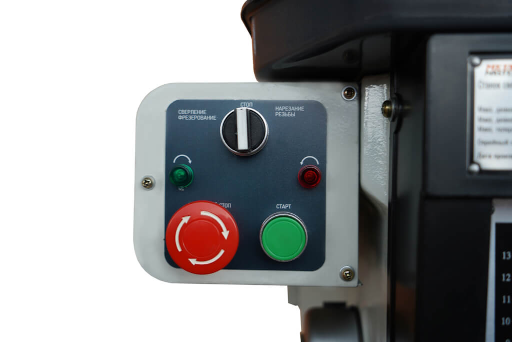 С левой стороны сверлильной головы расположены кнопки включения и выключения станка, а также тумблер изменения режима работы шпинделя. Станок оснащен функцией нарезания резьбы.