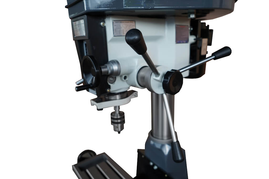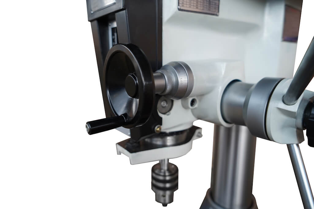 Высота сверлильной головы устанавливается с помощью вращения рукоятки, перемещение осуществляется по зубчатой рейке.