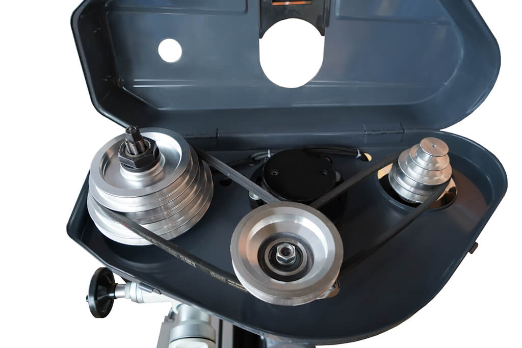 Скорость вращения шпинделя регулируется с помощью перекидывания ремней в блоке ременных шкивов. Схема положения ремней с диапазоном оборотов расположена с правой стороны станка. Широкий диапазон оборотов шпинделя от 100 до 2150 об/мин обеспечивает качественное сверление материалов.