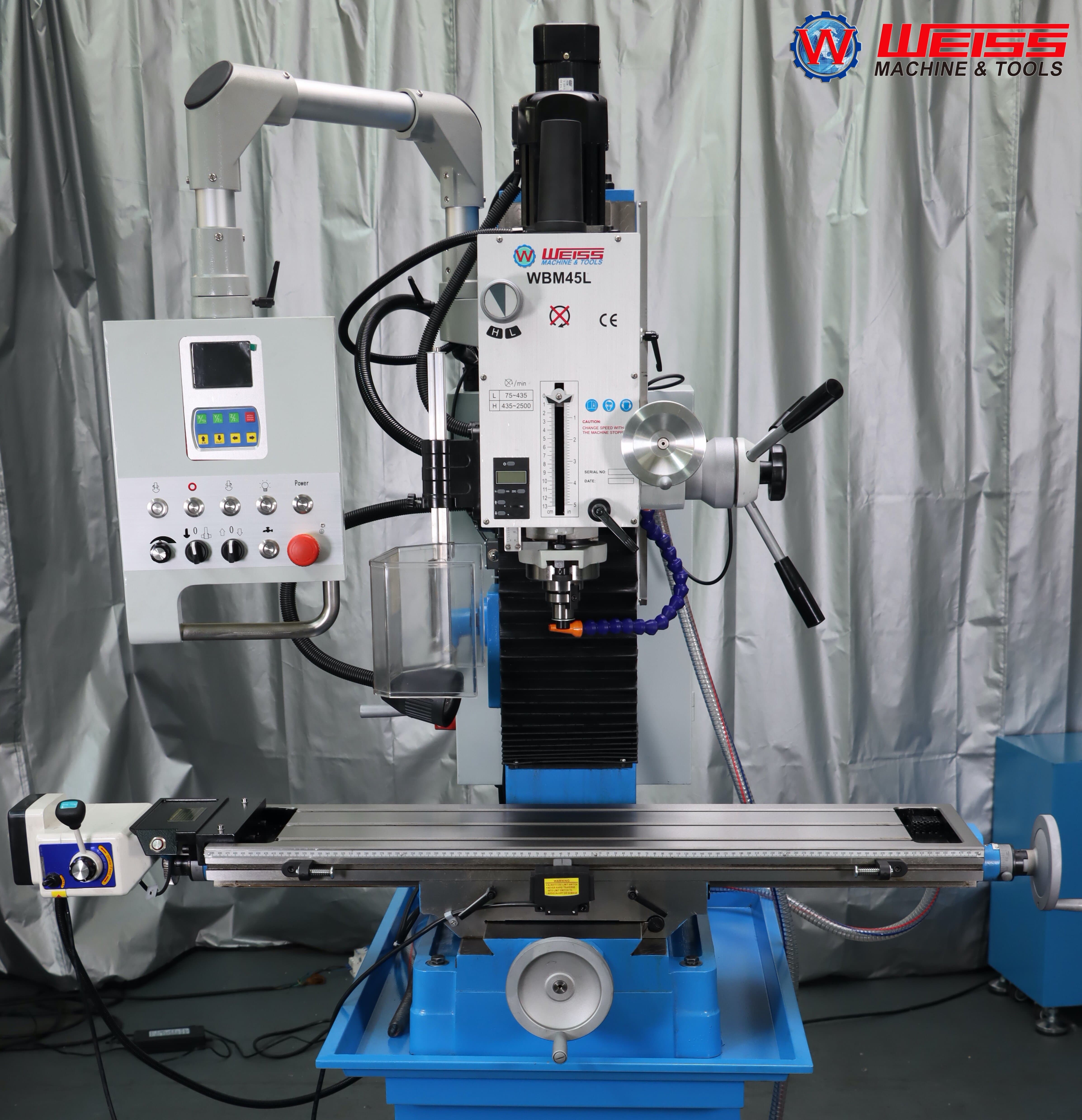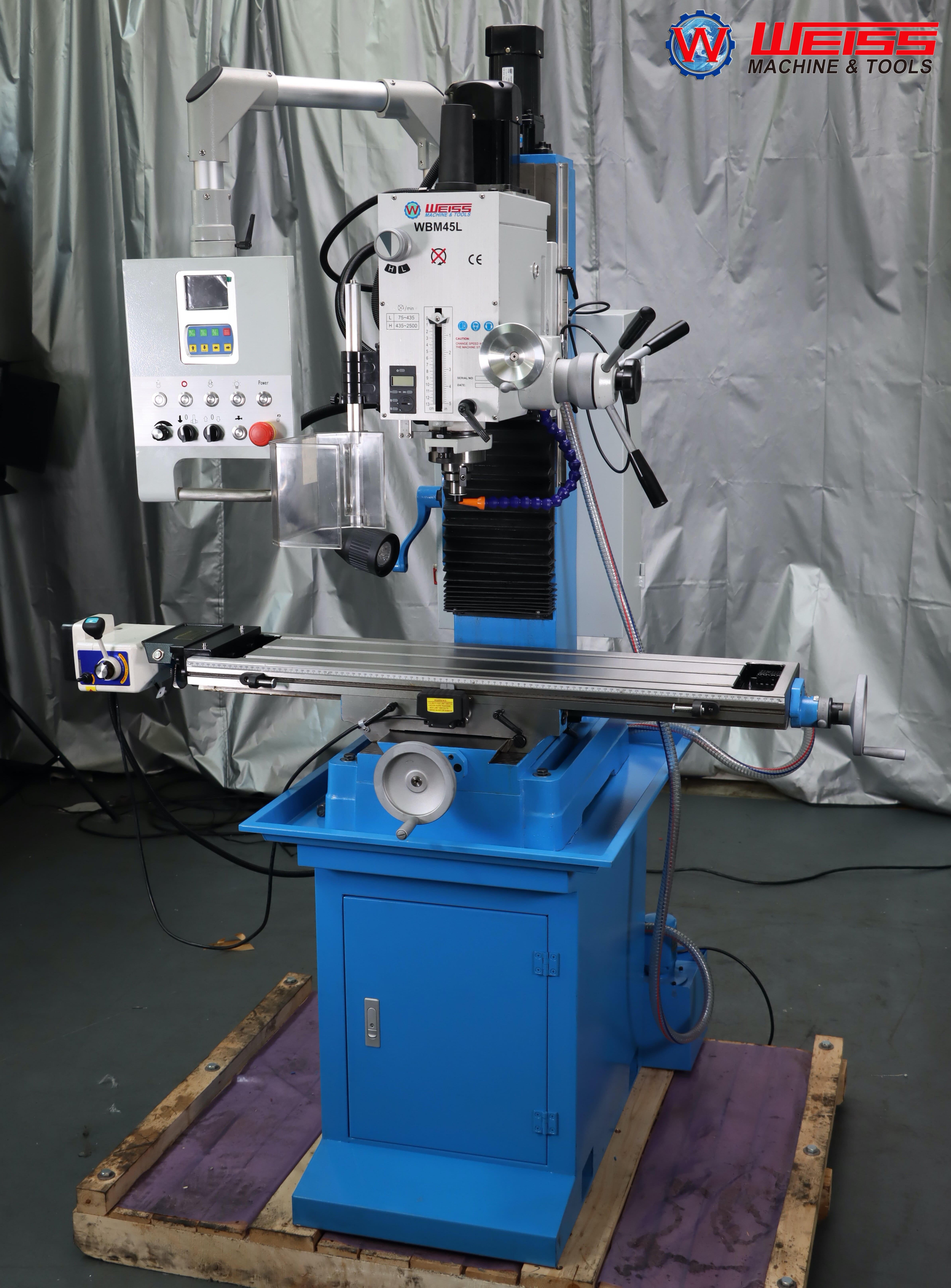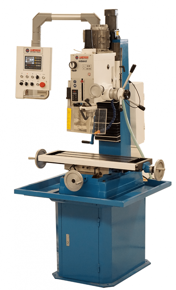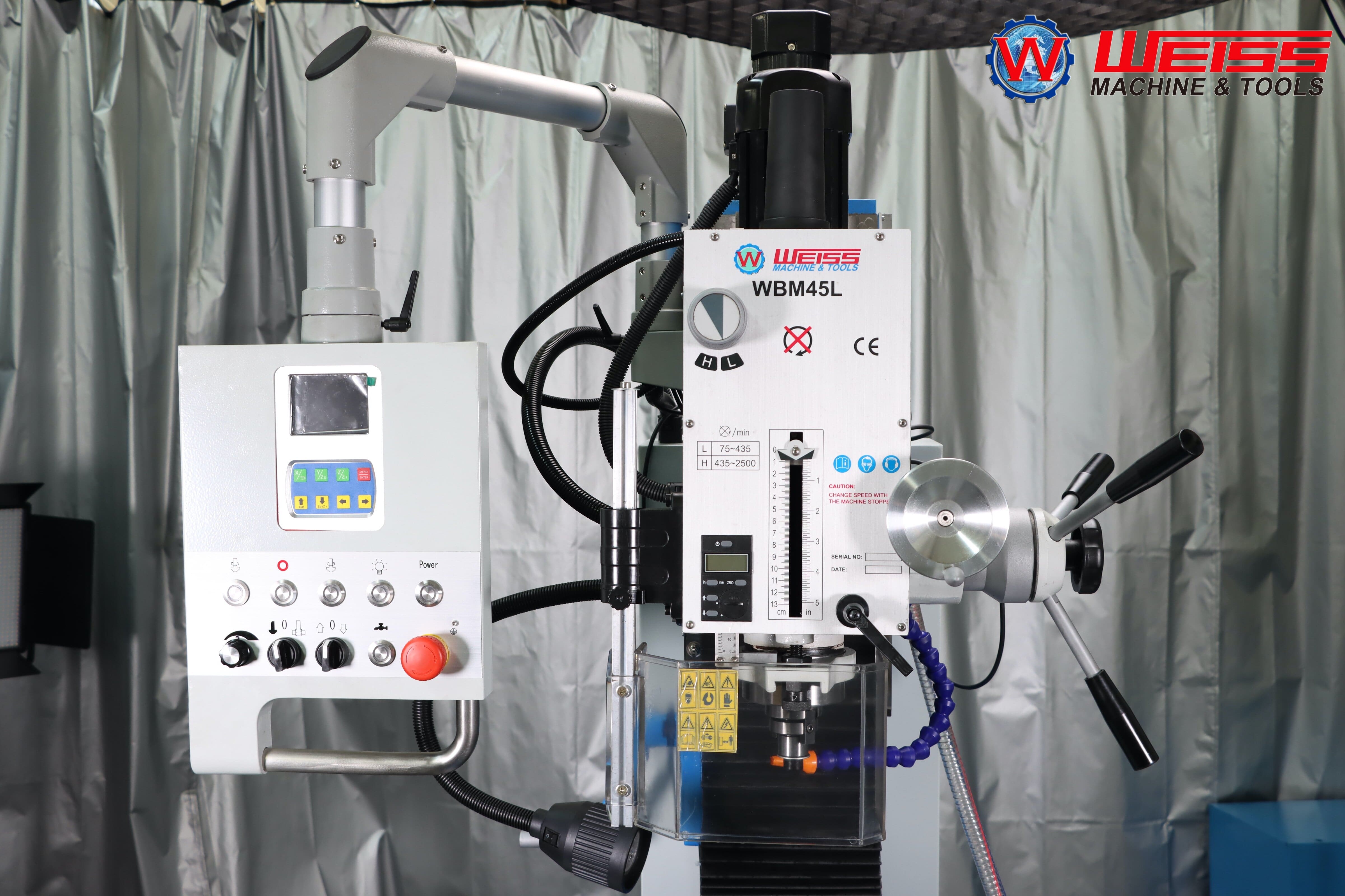 - WBM45L – это редукторный сверлильно-фрезерный с двумя диапазонами скоростей вращения шпинделя 75-435 об/мин, 435-2500 об/мин и бесступенчатым регулированием скорости в пределах каждого диапазона с помощью потенциометра;