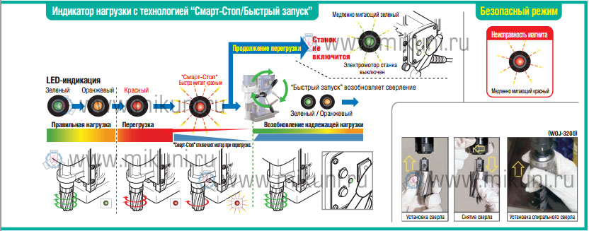При увеличении нагрузки во время сверления, индикатор нагрузки будет меняться в цвете от зеленого до оранжевого и красного. Кроме того, если применяется чрезмерная сила подачи, индикатор нагрузки будет быстро мигать красным и вращение электромотора будет замедляться и временно остановлено. Если нагрузка уменьшается в то время как индикатор нагрузки мигает красным, сверлильный станок возобновит вращение.