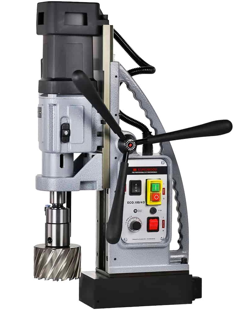 Станок на магнитном основании Euroboor ECO.100S+/T выполняет отверстия диаметром до 100 мм и подходит для нарезания резьбы до М30. ECO.100S+/T оснащен чрезвычайно мощным двигателем 1900 Вт., четырехступенчатой коробкой передач с масляной ванной и инновационной электроникой, которая обеспечивает высокий уровень безопасности, снижает риск повреждения станка, инструмента и заготовки и защищает пользователя в случае сильной вибрации или резкого смещения станка. Срок службы значительно увеличивается, и вы избегаете высоких затрат на техническое обслуживание.