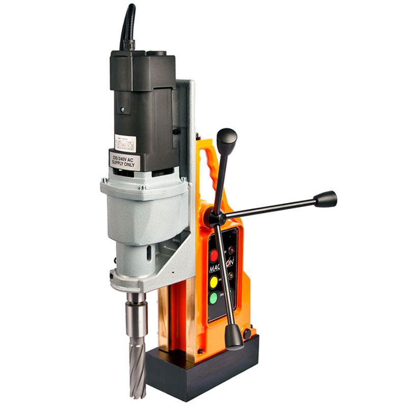 Сверлильная машина на магнитной подушке MBE 100 отличается высокими показателями производительности, надежности и безопасности. Мощный реверсивный двигатель этой машины создает крутящий момент, позволяющий выполнять корончатыми сверлами отверстия диаметром до 100 мм и нарезать резьбу до М30. Безопасность эксплуатации сверлильной машины обеспечивается за счет использования в конструкции двухскоростного редуктора проскальзывающей муфты. Сверлильный станок MBE 100 оптимален для операций сверления, зенкования, развертывания и нарезания резьбы.