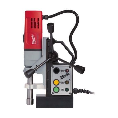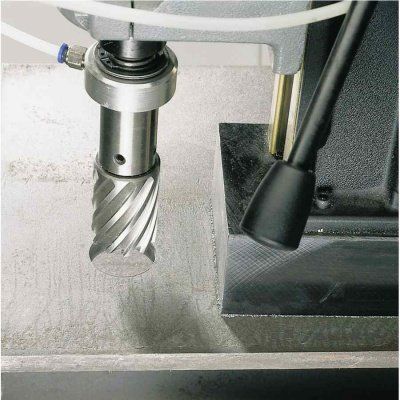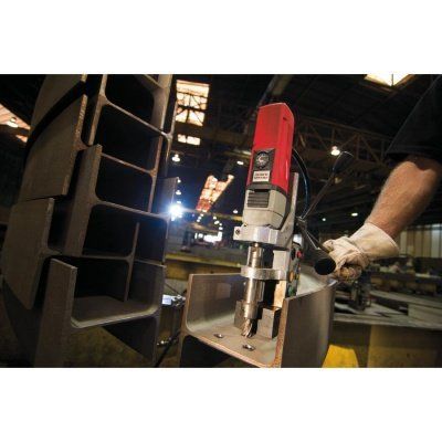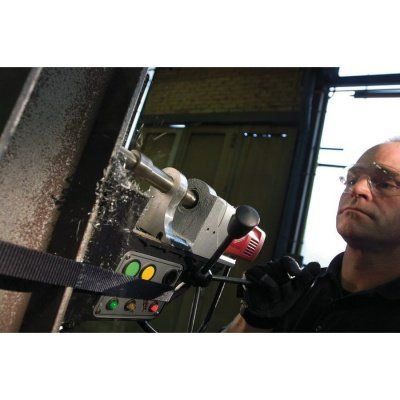 - Мощность 1200 Вт двигателя, передаваемая через трехступенчатый редуктор, позволяет сверлить с помощью коронок отверстия в стальных изделиях диаметром до 42 мм.