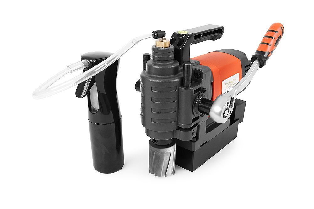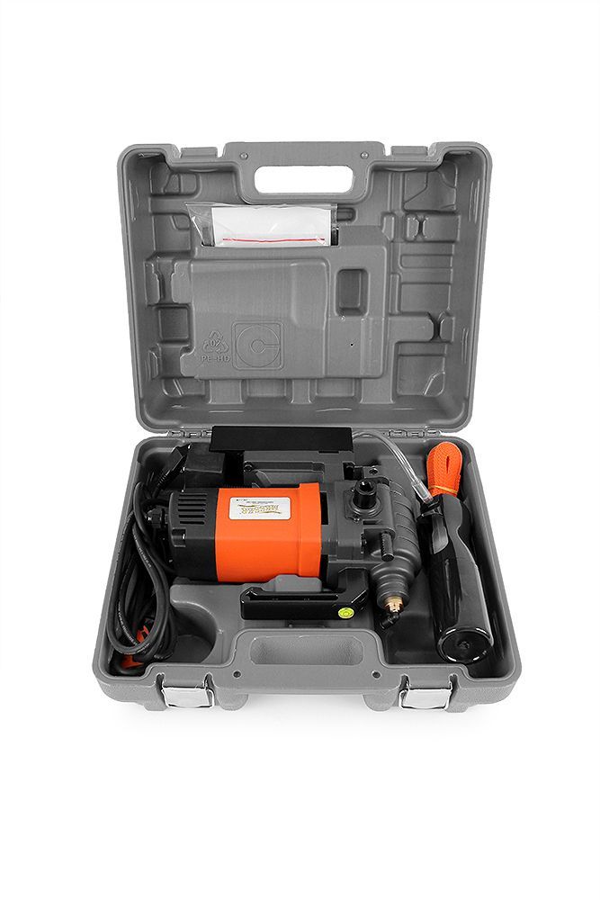 Сверлильный станок на магнитной основе MESSER MDMG-35 поставляется удобном для хранения и транспортитровки пластиковом кейсе в комплекте с пневмобачком принудительной подачи СОЖ, быстросъемной двусторонней реверсивной рукояткой подачи кольцевого сверла, ремнем безопасности и шестигранным ключом.