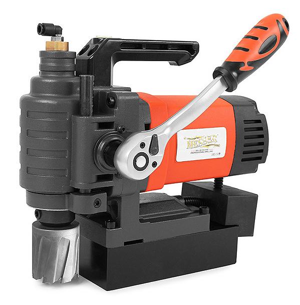 Для удобства работы в ограниченном пространстве станок имеет быстросъемную рукоять подачи фрезы с храповым механизмом, которую можно устанавливать как с правой, так и с левой стороны станка. Мощный двигатель позволяет выполнять сверление отверстий диаметром до 38 мм и глубиной до 35 мм.