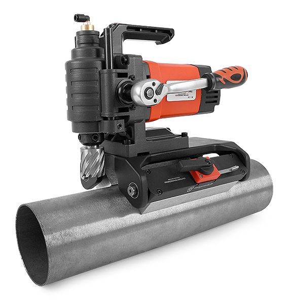 Сверлильный станок на магнитном основании для труб MESSER MDMGO-35 устанавливается на поверхности труб диаметром от 65 мм. В работе используются сверла с хвостовиками Weldon-19 и One-Touch.