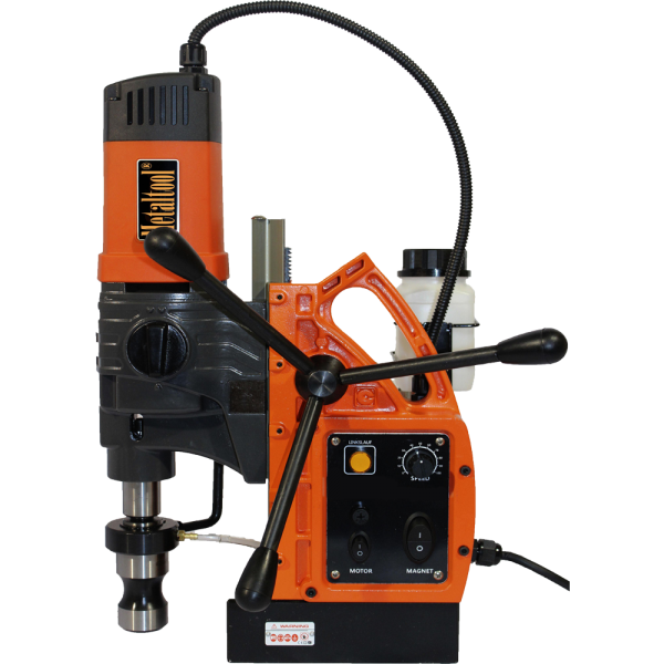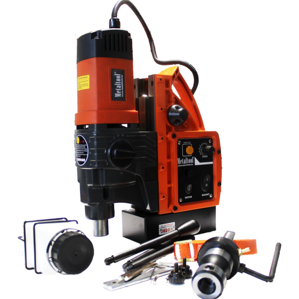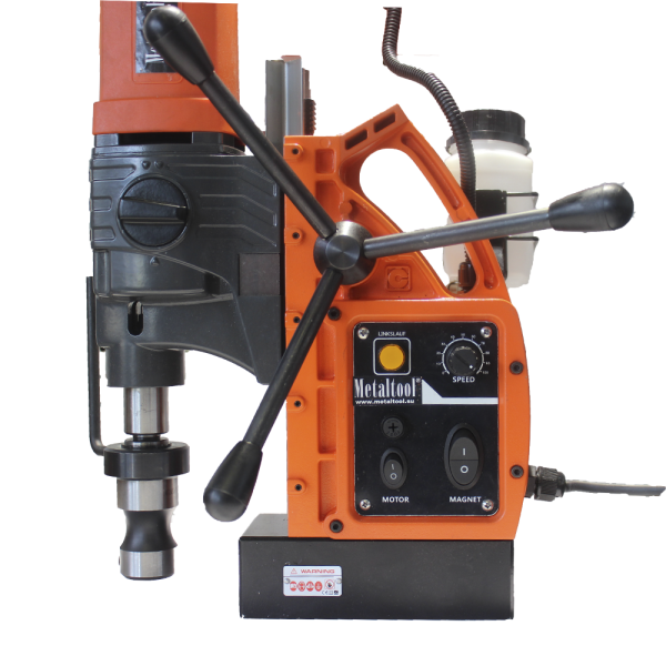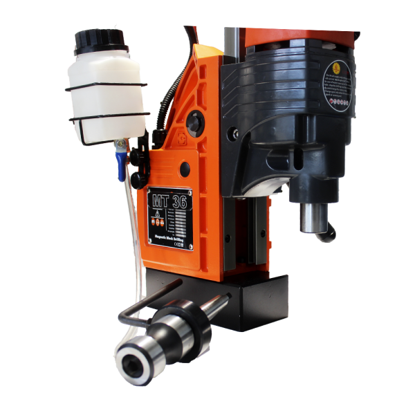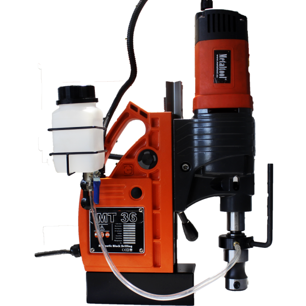 Сверлильный станок на магнитном основании MТ36 имеет плавную регулировку оборотов, легкий, при этом обладает достаточной мощностью для средних сверлильных работ корончатыми или обычными сверлами в условиях строительных площадок и стационарного производства. Станок закрепляется на металлическую конструкцию с помощью электромагнита. Сверление производится специальным полым (корончатым) сверлом, которое требует значительно меньших усилий, затрат энергии по сравнению со спиральным сверлом.