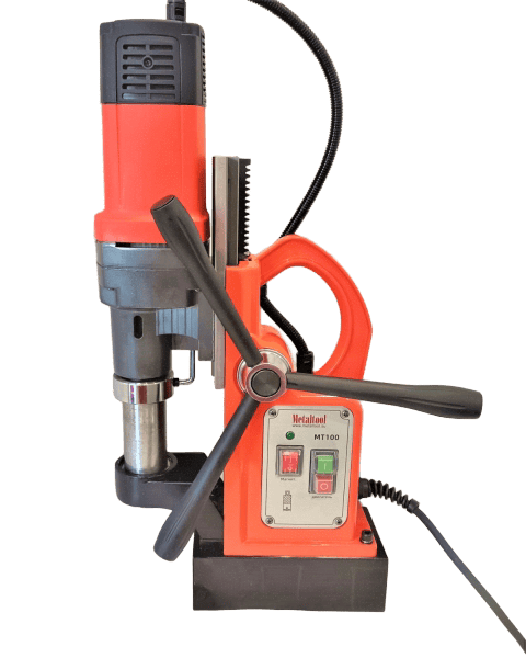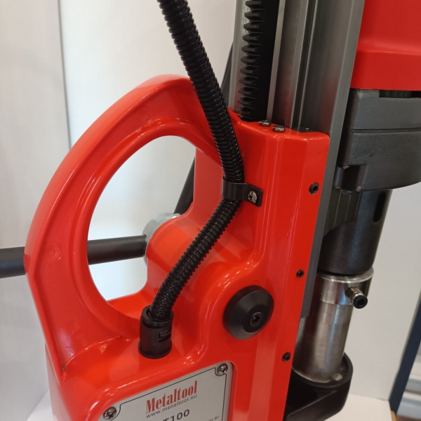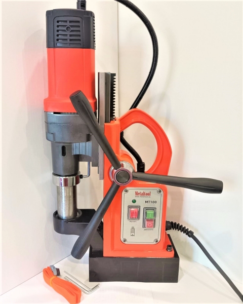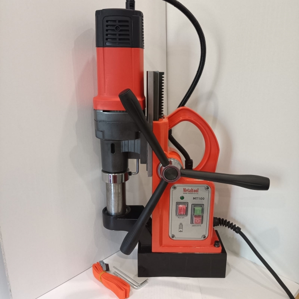 Магнитно-сверлильный станок MT 100 с мощностью двигателя 2200 Вт предназначен для средних сверлильных работ корончатыми или обычными сверлами в условиях строительных площадок и стационарного производства. Станок закрепляется на металлическую конструкцию с помощью электромагнита. Сверление производится специальным полым (корончатым) сверлом, которое требует значительно меньших усилий, затрат энергии по сравнению со спиральным сверлом.