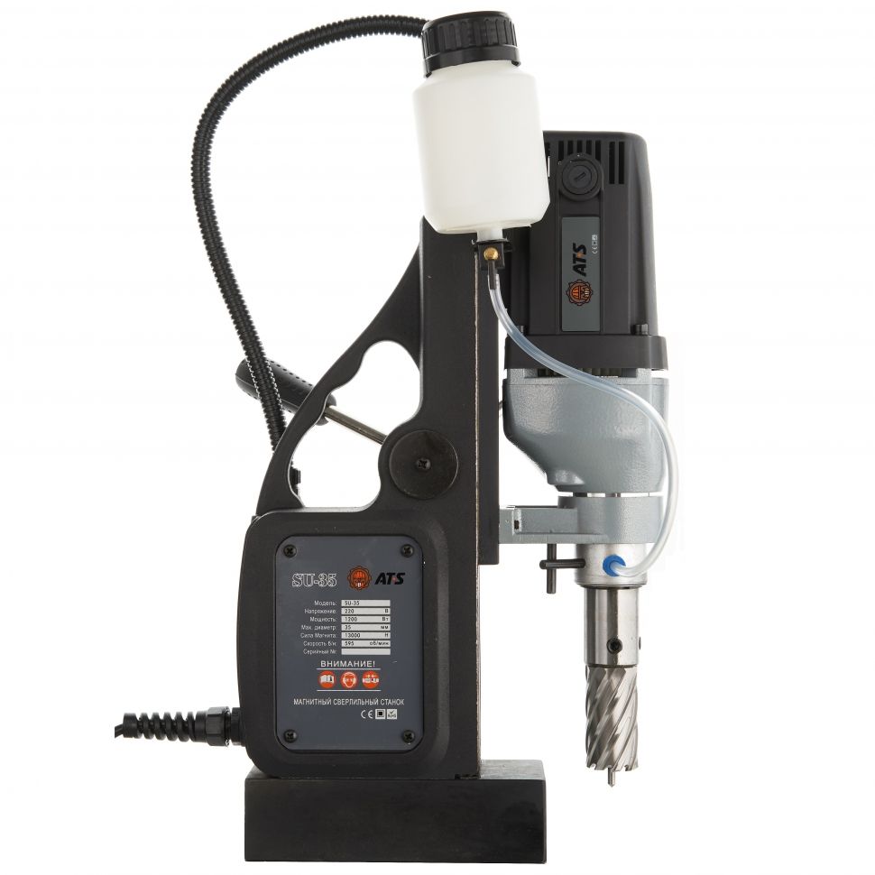 Бюджетный по цене вариант станка дополнительно укомплектован трехкулачковым патроном, позволяющим сверлить спиральными сверлами диаметром до 13 мм. Встроенная система охлаждения подает СОЖ внутрь корончатого сверла во время сверления, что предотвращает перегрев сверла и дает возможность легко выходить керну. SU-35 отличается надежностью и простотой в эксплуатации. Рабочий ход станка (130 мм) позволяет без усилий менять инструмент и производить сверление выше уровня магнита. Подходит для мастерских, небольших производств и потоковых краткосрочных работ. Легкий для данной категории станков вес (12 кг) делает его особенно привлекательным для работ на высоте и в вертикальном положении, когда многое зависит от силы и выносливости оператора.