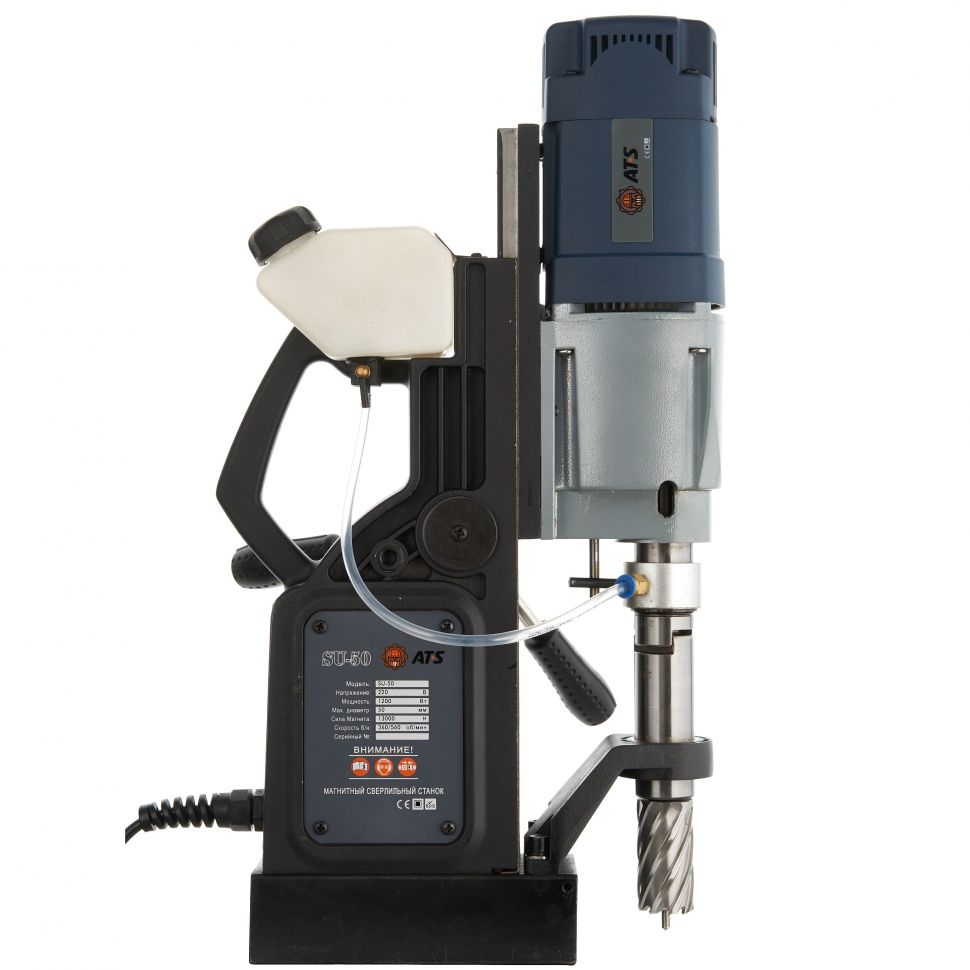 Основные преимущества SU-50 – это двухскоростной привод и посадочное гнездо шпинделя – Конус Морзе 2. Станок дает возможность сверлить корончатыми сверлами диаметром до 50 мм и спиральными сверлами с коническим хвостовиком (в комплект поставки входит переходная втулка КМ2/КМ1) диаметром до 23 мм. Эргономичный бачок для подачи СОЖ крепится в специальные пазовые углубления на станине. На станке установлена система внутренней прокладки кабеля, что не позволит провиснуть или перетянуть его при ограничении окружающего пространства. Для сверления спиральными сверлами с коническим хвостовиком необходимо снять опорный кронштейн и держатель КМ2/Weldon 19 (ход станка увеличивается при этом до 130 мм).