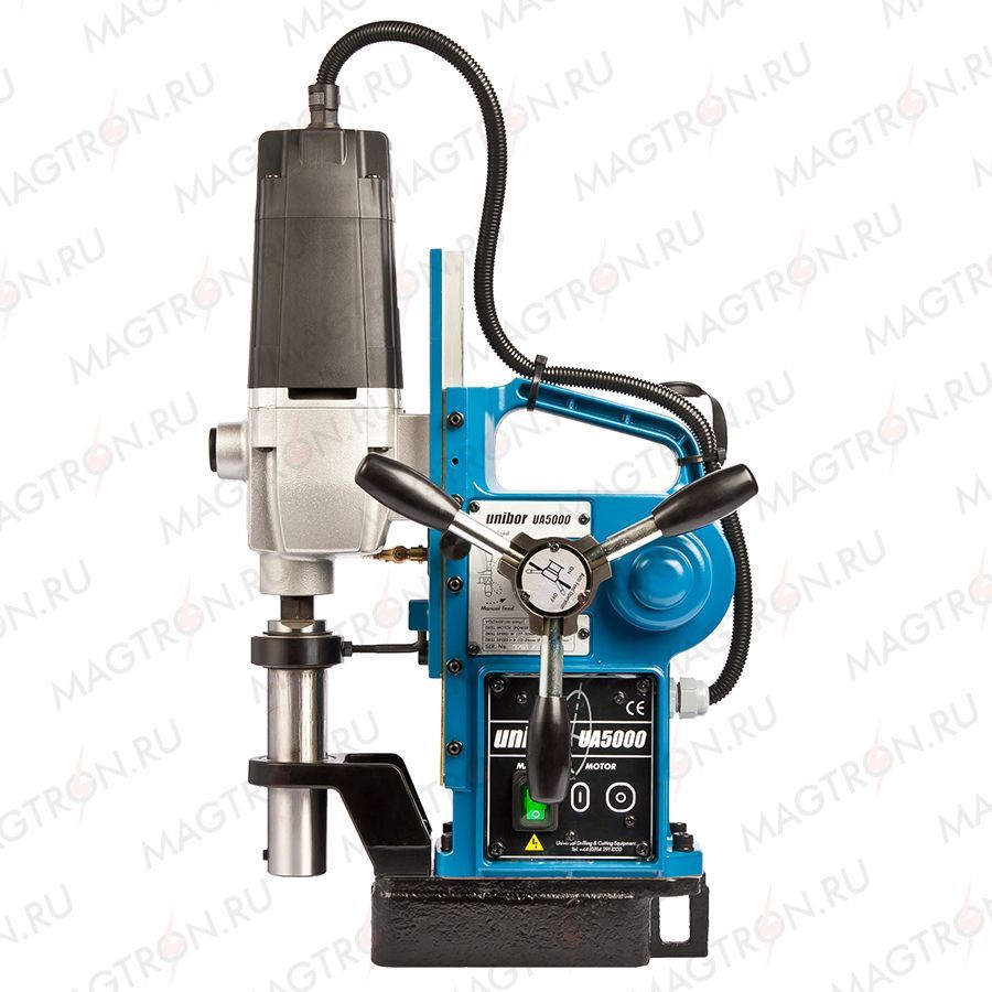 Автоматическая магнитная дрель UA 5000 специально разработана для сверления в металле большого количества отверстий. Автоматизация работы сверлильного станка UA 5000 обеспечивается за счет специальных датчиков, которыми оснащен этот станок. Автоматические датчики позволяют одному оператору одновременно управлять несколькими такими станками. Электродвигатель имеет режим пониженных оборотов, позволяющий производить сверление сверлами из быстрорежущей стали. В процессе сверления автоматическая подача изменяется в зависимости от нагрузки (на этапе врезания подача замедляется).