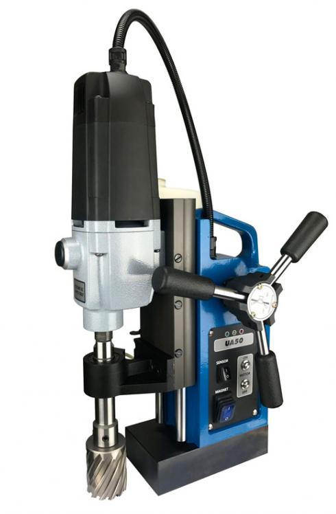 Магнитный сверлильный станок Magtron UA50 — новый станок с немецким двигателем, регулиющий скорость вращения фрезы. Автоматическая подача станка позволит упростить рабочие моменты и сделает сверление деталей наиболее безопасным. При сильной нагрузке подача и вращение дрели автоматически останавливается датчиком, который регистрирует силу тока.