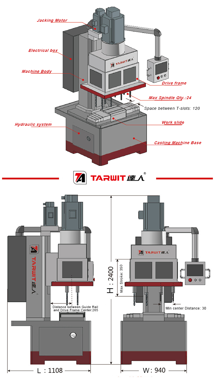 3) Центральное расстояние между отверстиями можно регулировать произвольно в пределах от 30 мм до 300 мм. Положение шпинделя сверлильного станка можно регулировать произвольно в пределах 180*300 мм.