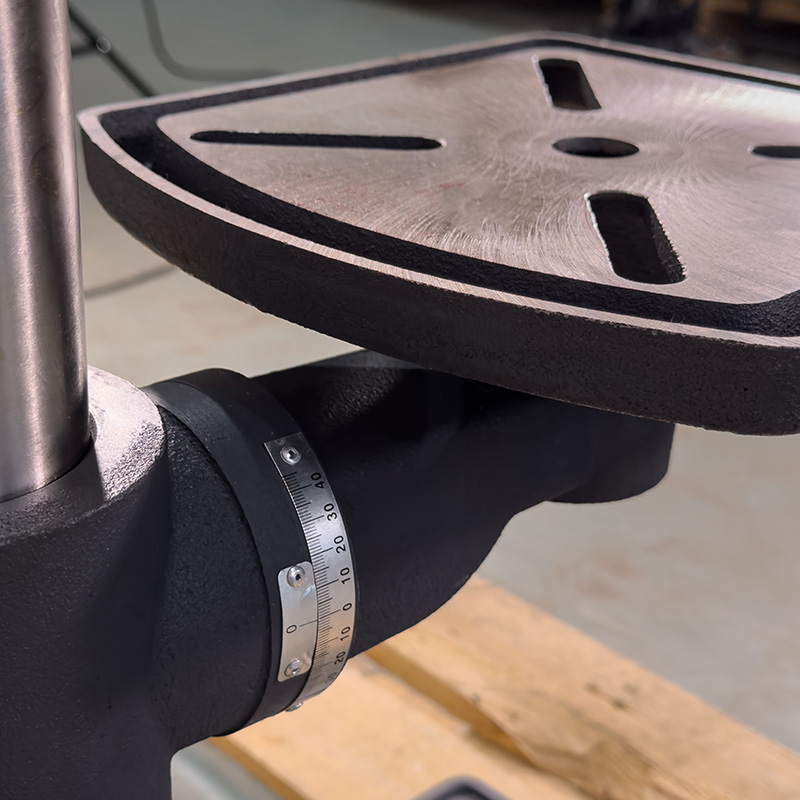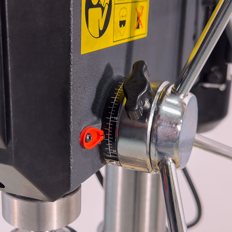 Особенностью станка E-1316B/400 является дополнительная возможность выбора направления вращения шпинделя. Кроме этого, станок снабжен радиальными подшипниками. Существует возможность обработки деталей под различными углами за счет поворота стола с помощью поворотной цапфы (угол поворота — 360 град.), а также наклона стола на 45 градусов. Глубина сверления может регулироваться в зависимости от поставленных задач. Рабочая зона станка E-1316B/400 — с подсветкой.