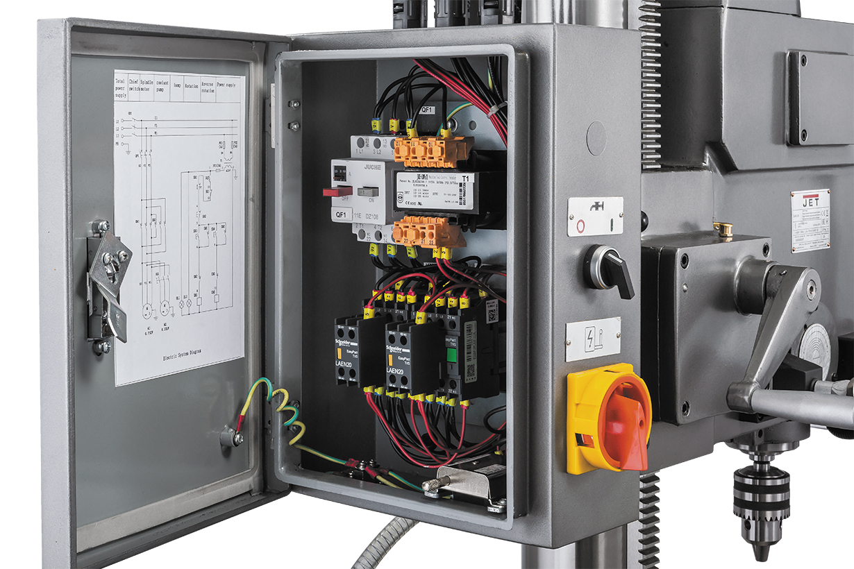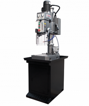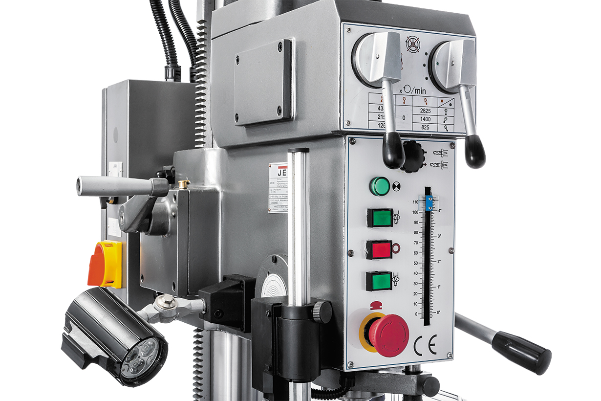 Редукторный сверлильный, настольный станок JET GHD-25 самый маленький станок в линейке JET. На станке установлен двигатель мощностью 0,75 кВт, вращение на шпиндель передается через коробку скоростей, что исключает прокрутку, остановку и застревания режущего инструмента в заготовке. Весь момент передается на шпиндель. Максимальный диаметр сверления в стали составляет 25 мм, а в чугуне максимальное отверстие составляет 30 мм. Станок способен нарезать резьбы до М18. Станок подключается к сети 380В и имеет 2 направления вращения шпинделя, направление вращения переключается на лицевой панели станка, так же на лицевой панели расположена коробка переключения скоростей, всего их 6 от 125 до 2825 об/мин. На станке предусмотрена возможность регулировки глубины сверления, что позволяет выполнять работы в серийном режиме.