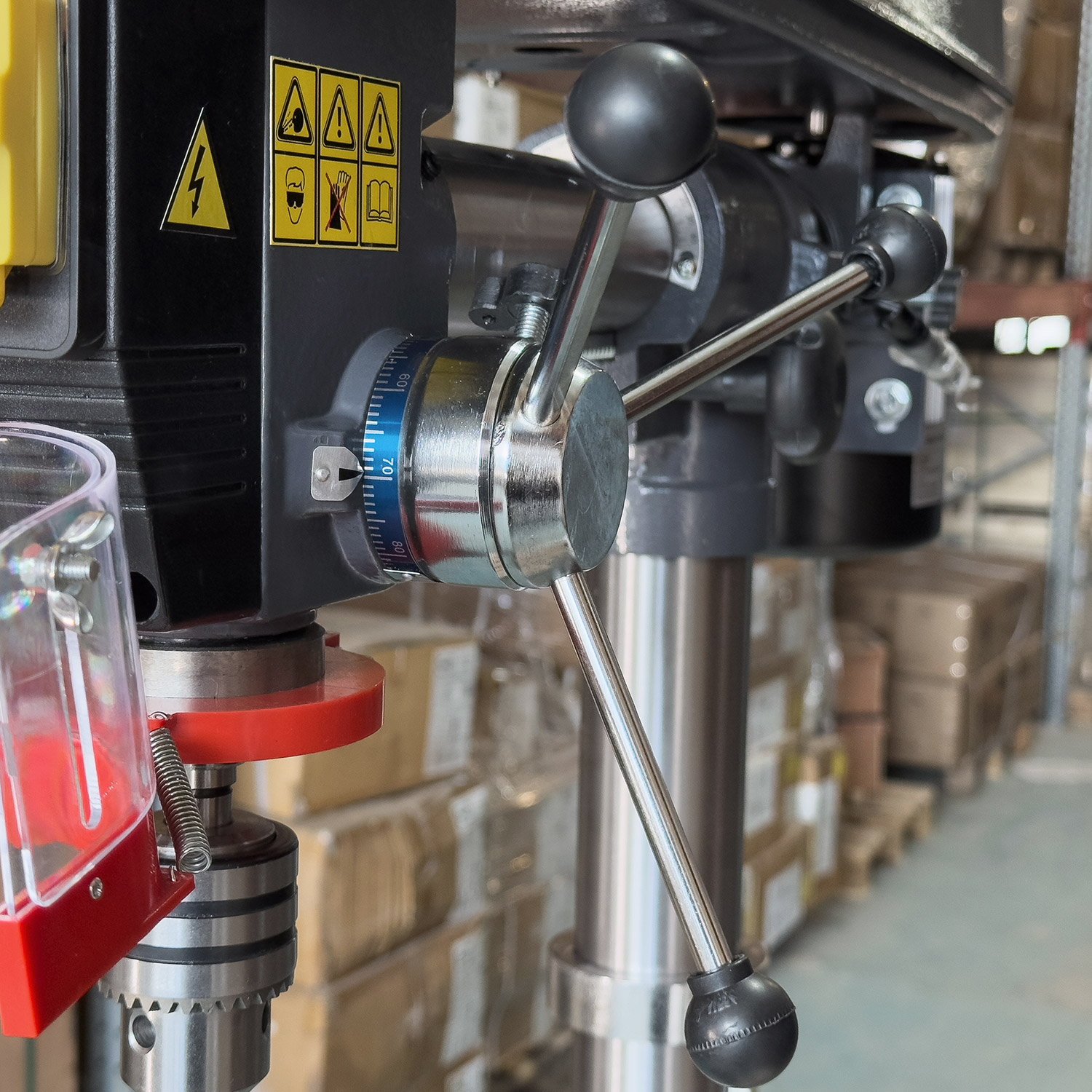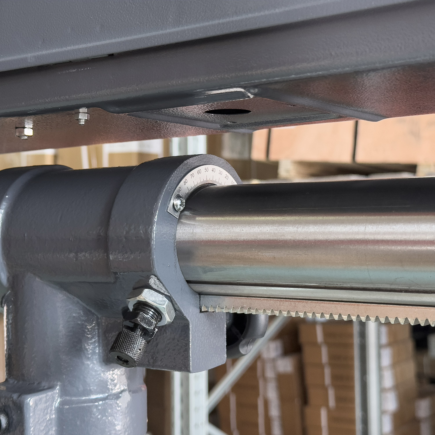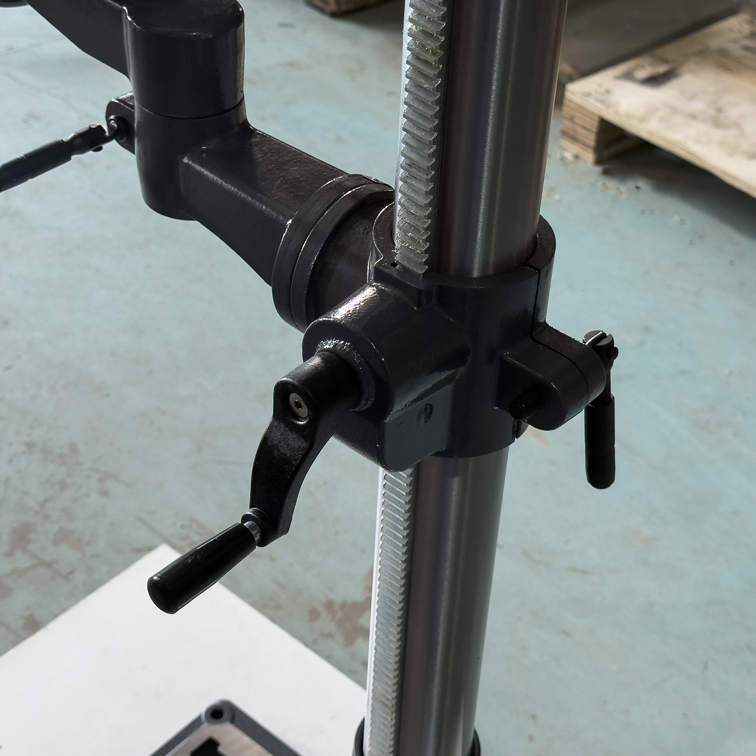 - Сверлильная головка: Двигается по рейке, крутится вокруг колонны и регулируется по углу для сложных подходов.
