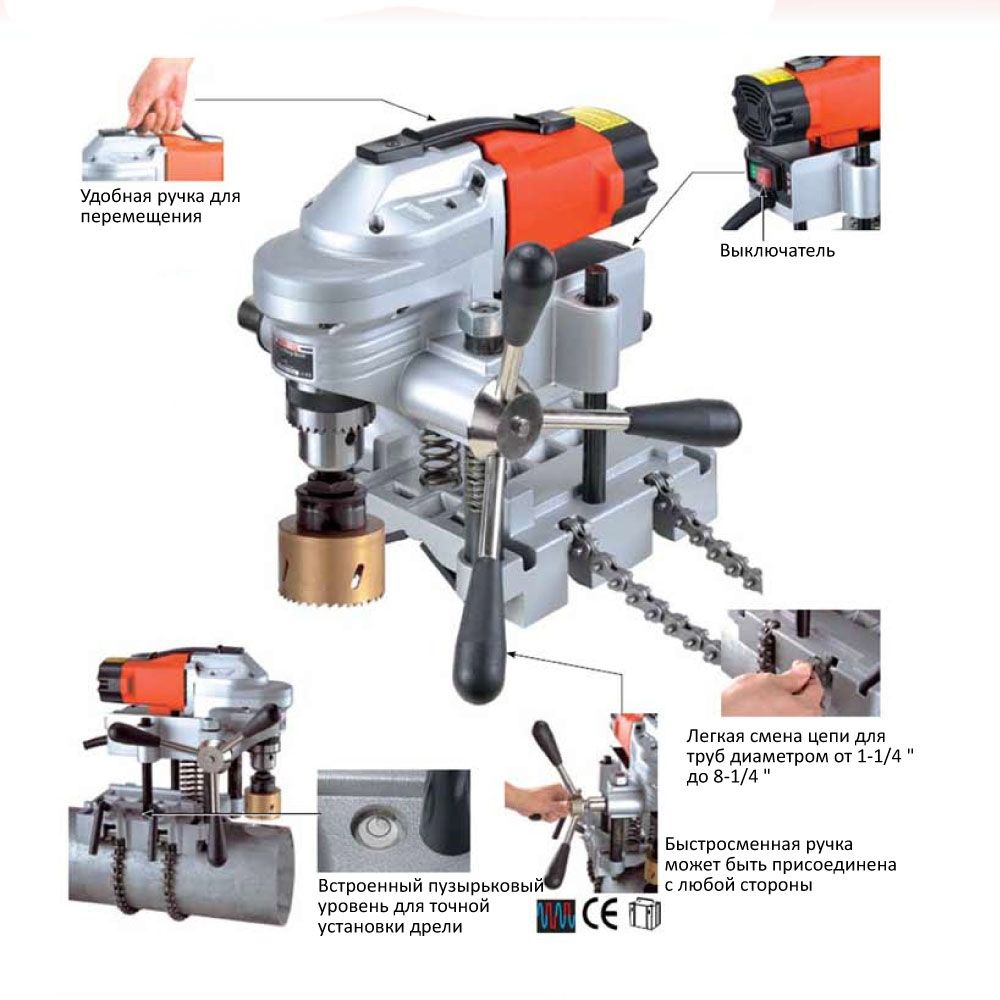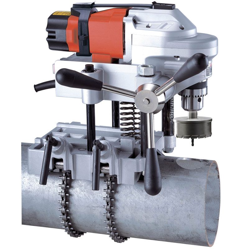 Специализированный сверлильный станок разработанный для производительного, точного и удобного сверления в трубах, диаметр отверстий до 127 мм. Диапазон диаметров труб от 32 до 203 мм c возможностью расширения до 600 мм.