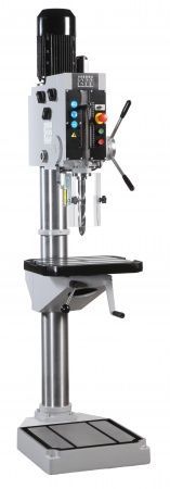 Вертикально-сверлильный станок A4008 M - Сверлильные станки серии А4008M с прочным поворачивающимся столом, изготовленным из отливки высококачественной стали. Рабочий стол имеет Т-образный паз и канал для стока СОЖ, установлен на прочный кронштейн, вращающийся на 360 градусов вокруг стойки станка. Подъем и опускание рабочего стола (для установки на удобную для оператора высоту) осуществляется рычагом. Сверлильная головка станков имеет возможность поворота на 360 градусов и может перемещаться в вертикальном направлении. Коробка передач сверлильного станка на косозубых цилиндрических зубчатых колесах, контактирующих со стальными и усиленными фторопластовыми шестернями. Станки A4008 M могут под заказ оборудоваться системой подачи СОЖ. На станке модели А-4008 (М) стол зафиксирован.