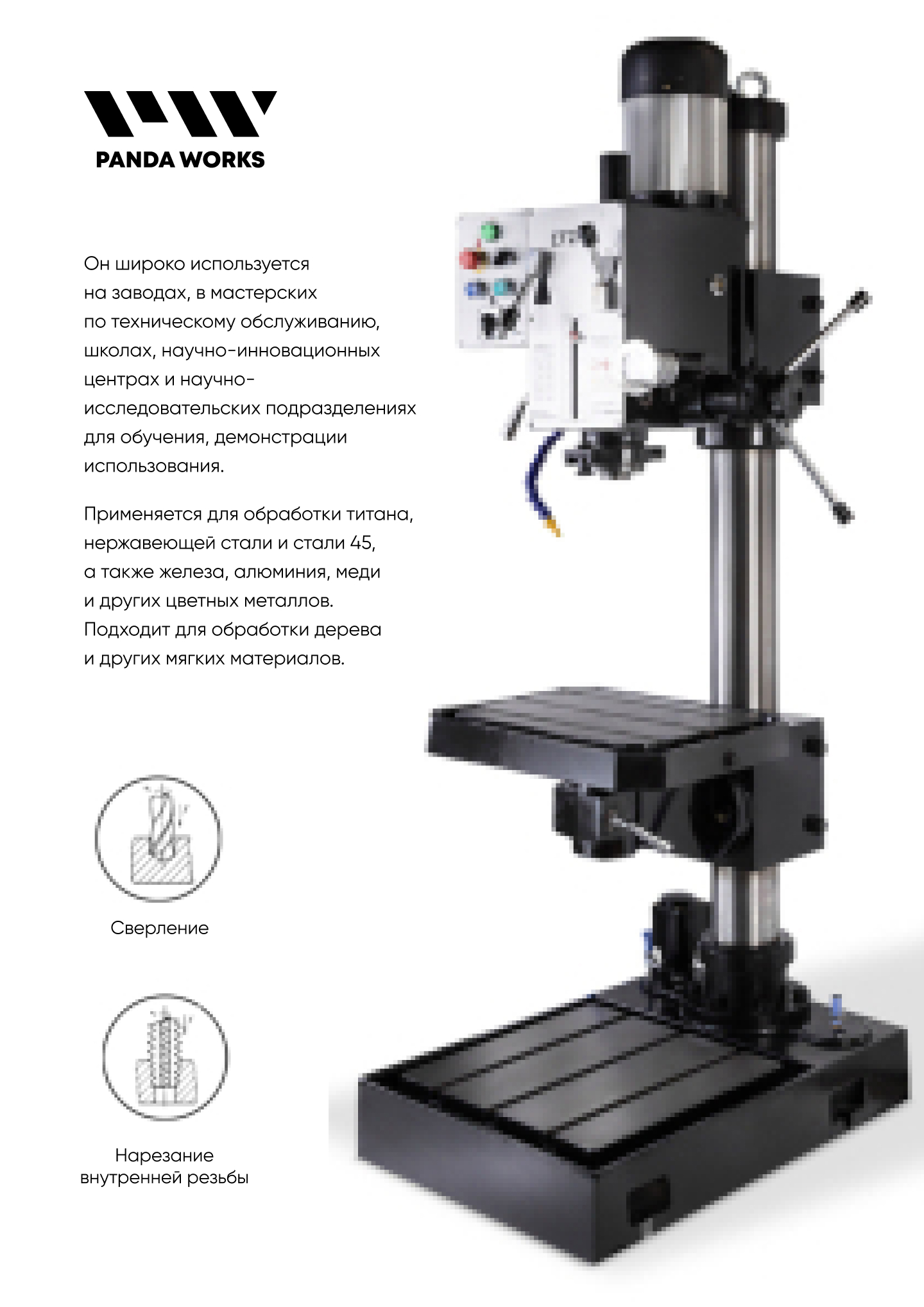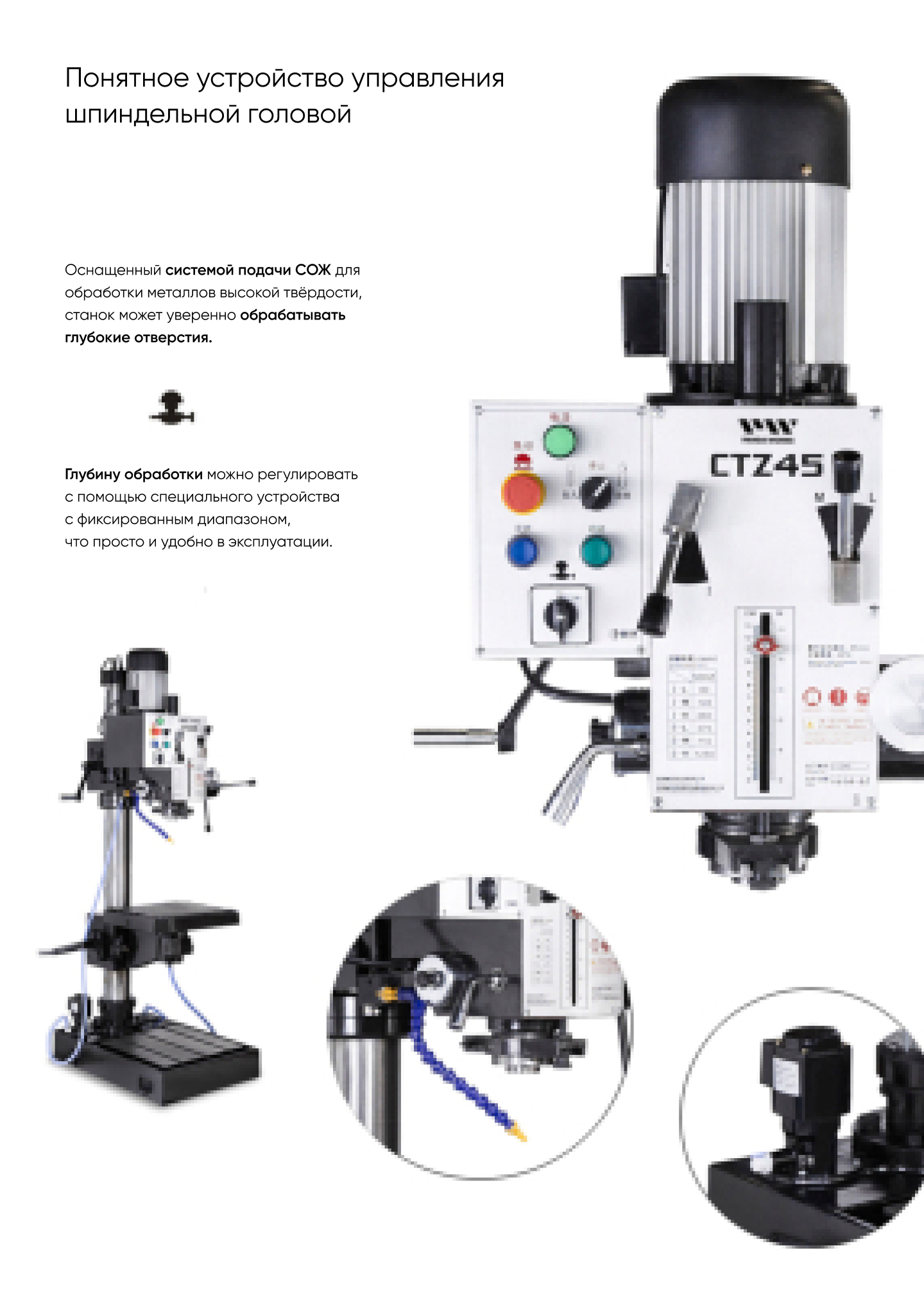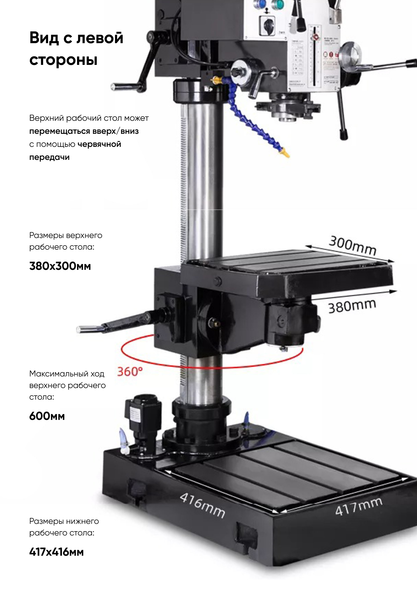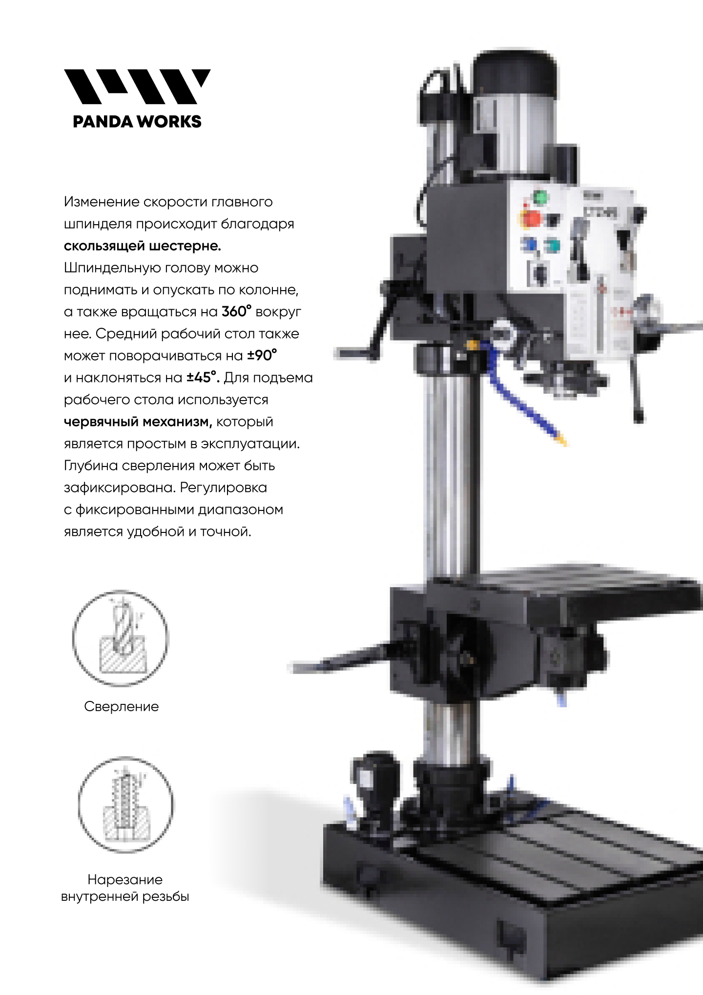 Изменение скорости главного шпинделя происходит благодаря скользящей шестерне. Шпиндельную голову можно поднимать и опускать по колонне, а также вращаться на 360° вокруг нее. Средний рабочий стол также может поворачиваться на ±90° и наклоняться на ±45°. Для подъема рабочего стола используется червячный механизм, который является простым в эксплуатации. Глубина сверления может быть зафиксирована. Регулировка с фиксированными диапазоном является удобной и точной.