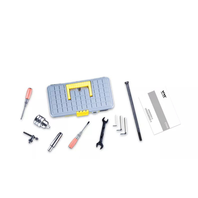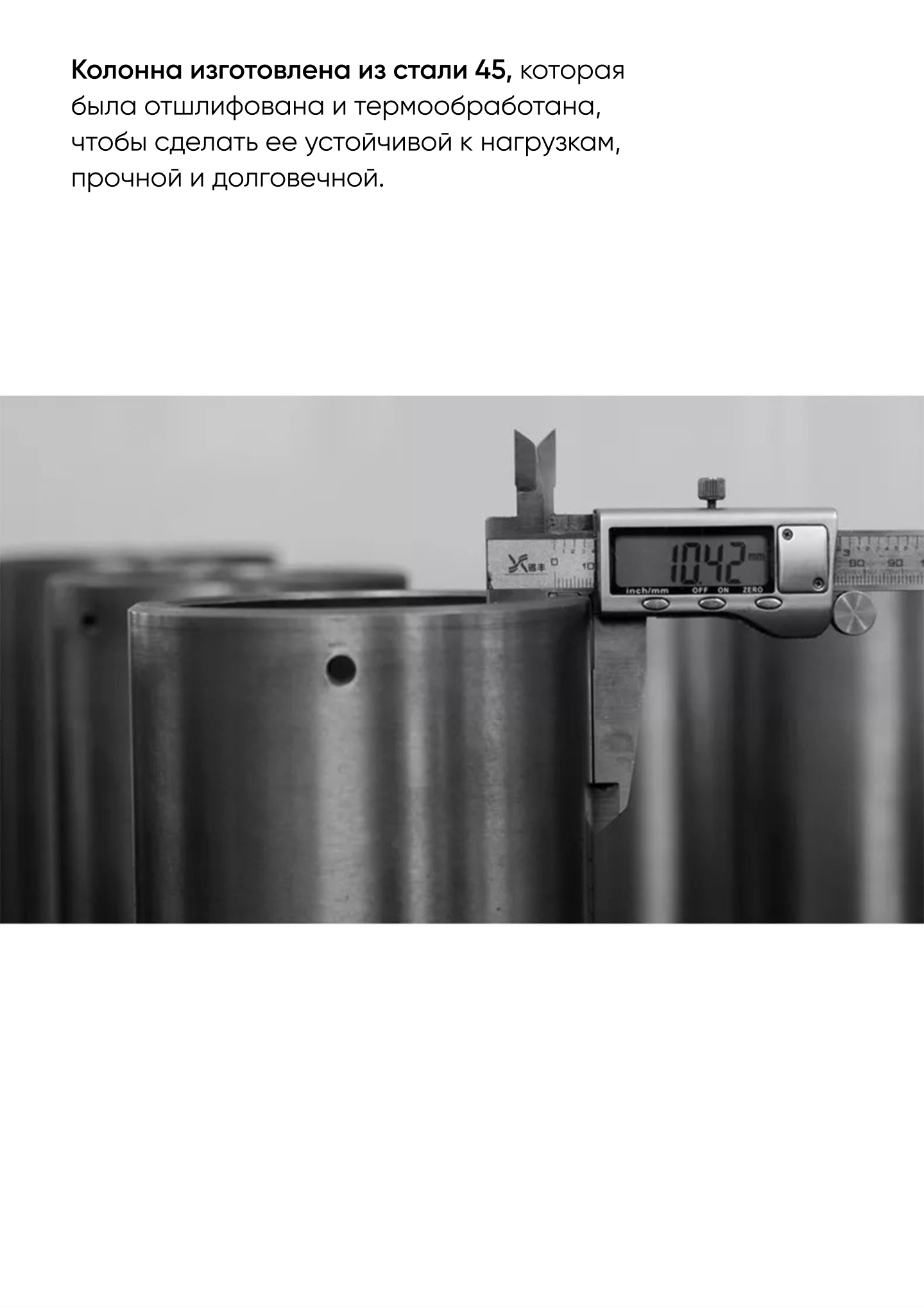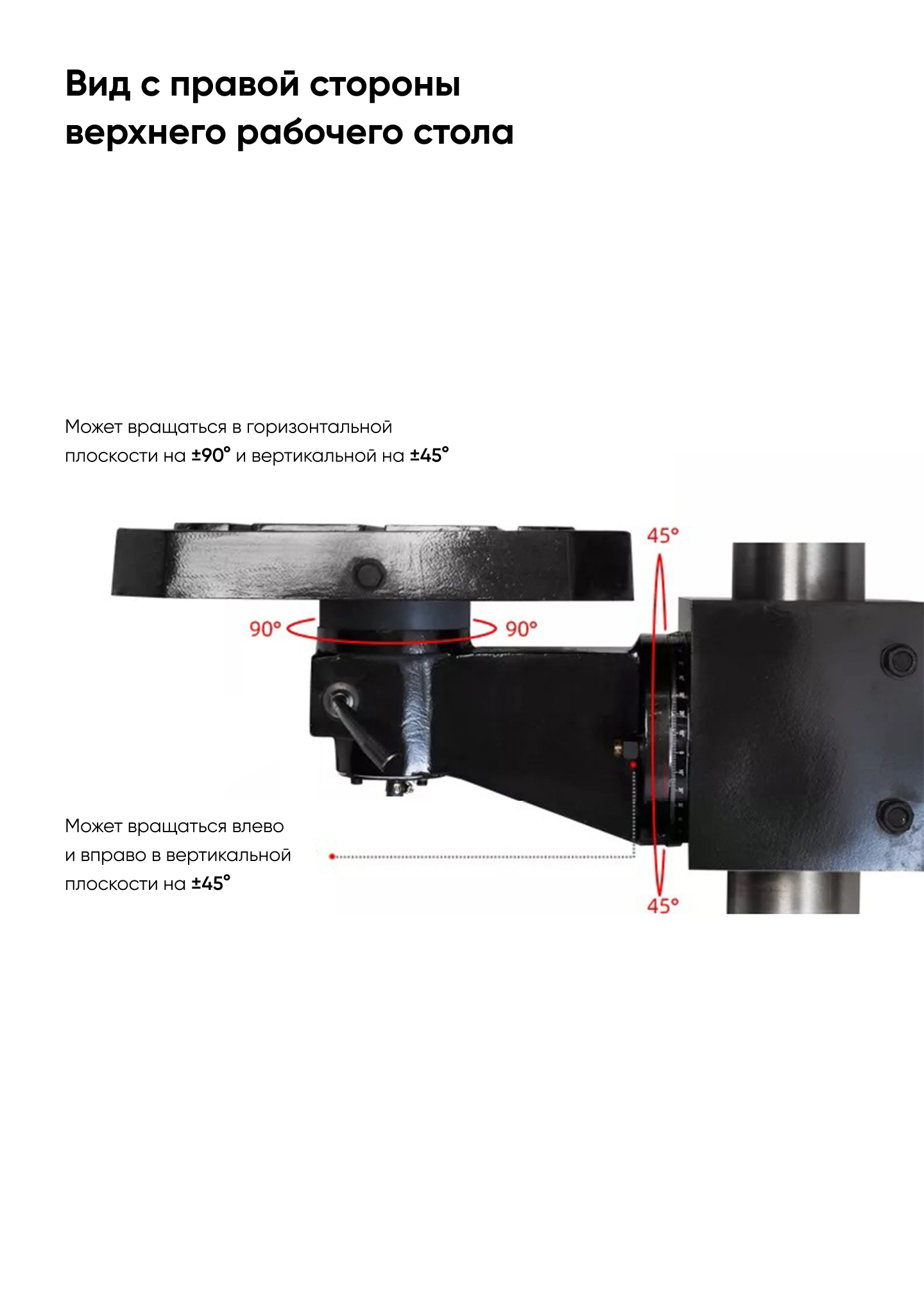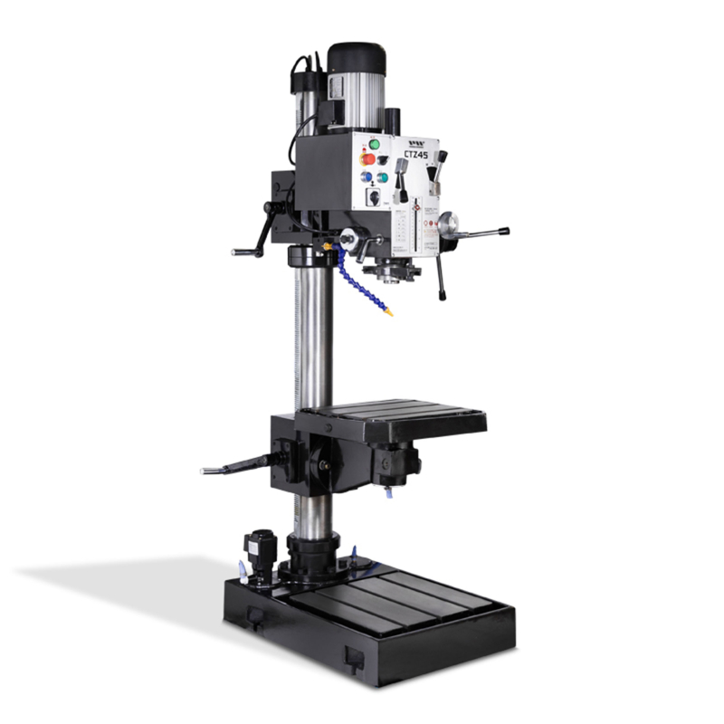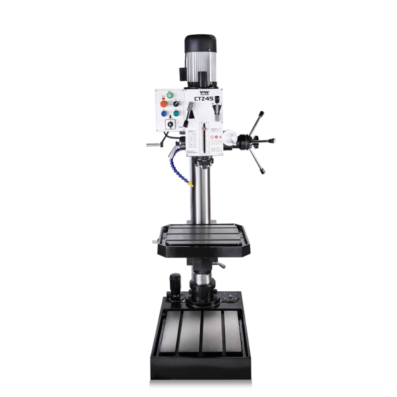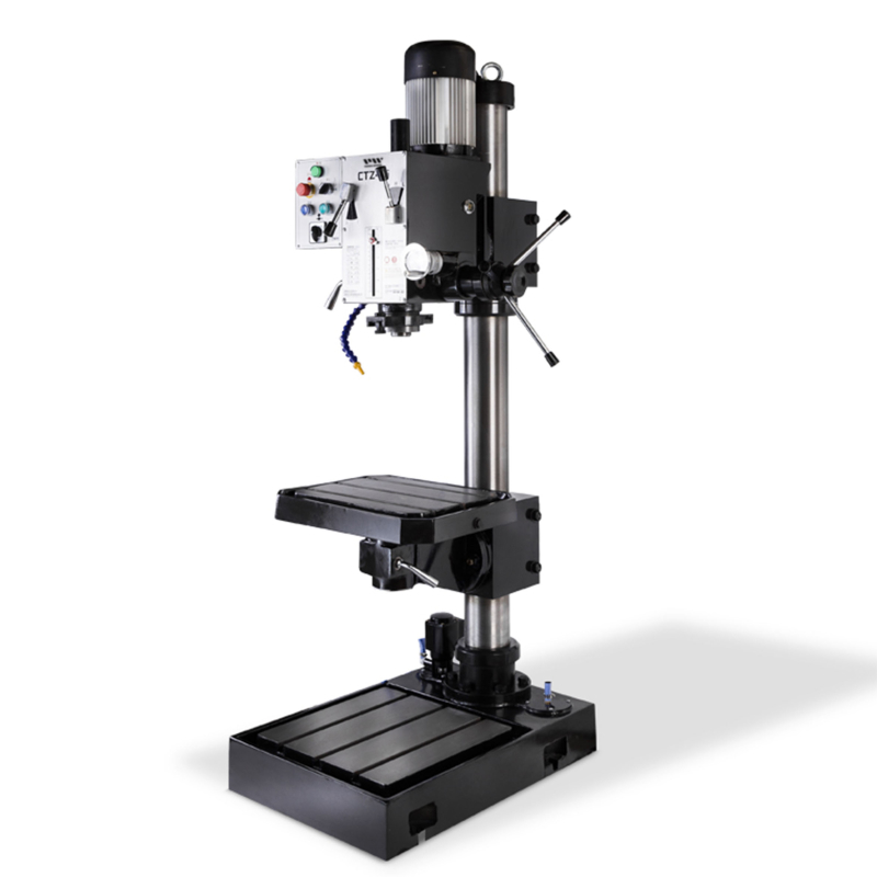 Изменение скорости главного шпинделя происходит благодаря скользящей шестерне. Шпиндельную голову можно поднимать и опускать по колонне, а также вращаться на 360° вокруг нее. Средний рабочий стол также может поворачиваться на ±90° и наклоняться на ±45°. Для подъема рабочего стола используется червячный механизм, который является простым в эксплуатации. Глубина сверления может быть зафиксирована. Регулировка с фиксированными диапазоном является удобной и точной.