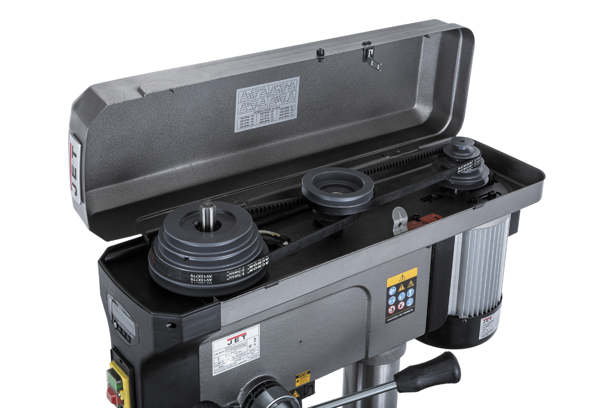 JDP 20FTD оснащен трехфазным асинхронным двигателем на 1.1 кВт, с питанием от промышленной сети в 400 В. Станок способен сверлить отверстия с максимальным диаметром до 25 мм. Вращающий момент с вала двигателя на шпиндель передается толстый клиновой ремень. На станке 12 скоростей в диапазоне от 180 до 2510 об/мин.