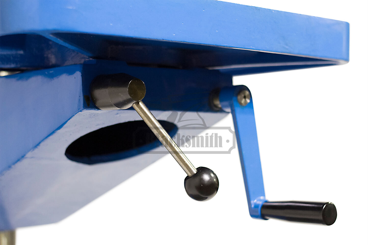 Заготовка надежно крепится на массивном столе с Т-образными пазами. Стол можно регулировать по высоте с помощью зубчатого механизма. Кроме того, стол можно развернуть в нужном положении вокруг вертикальной оси.