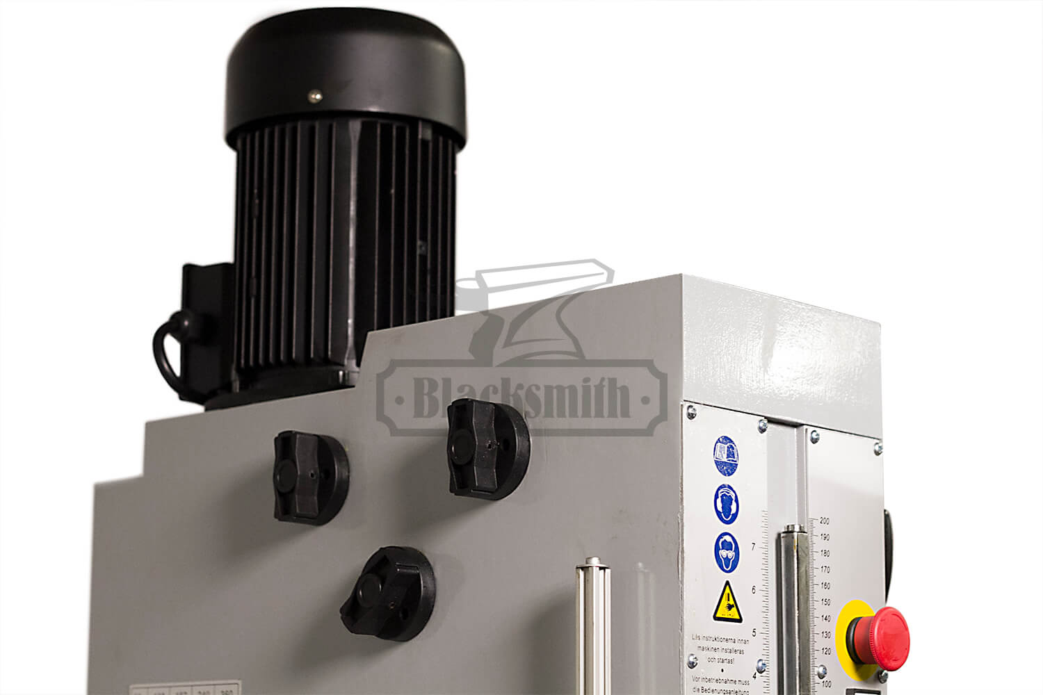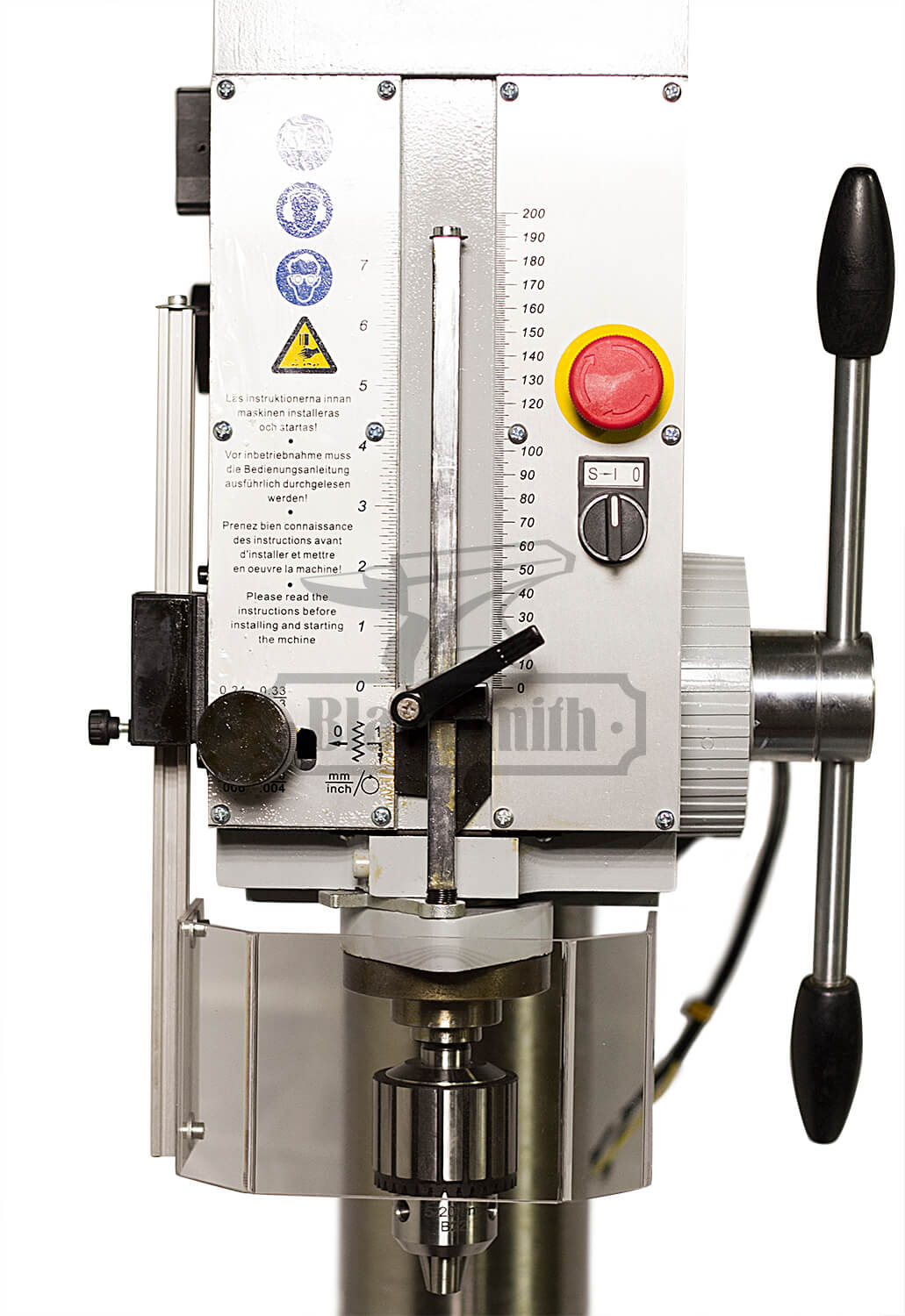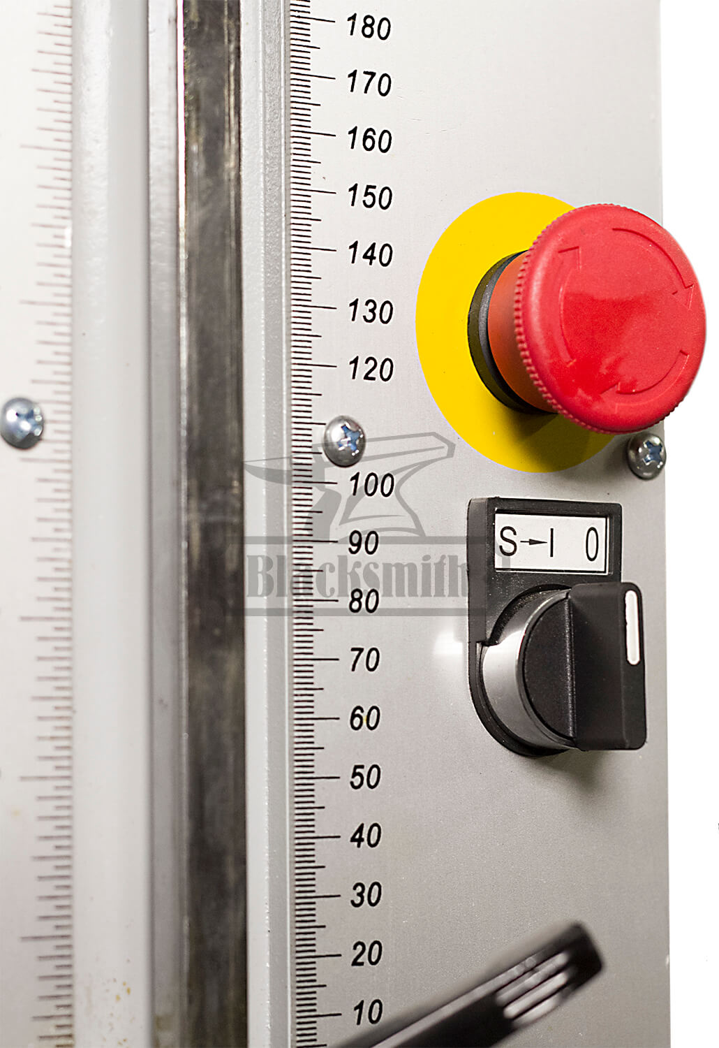 На центральной панели станка T-40 расположен механический ограничитель глубины сверления, кнопка запуска, кнопка аварийной остановки и переключатель автоматической микроподачи с регулятором скорости. Когда достигается нужная глубины сверления, станок возвращается в исходное положение.