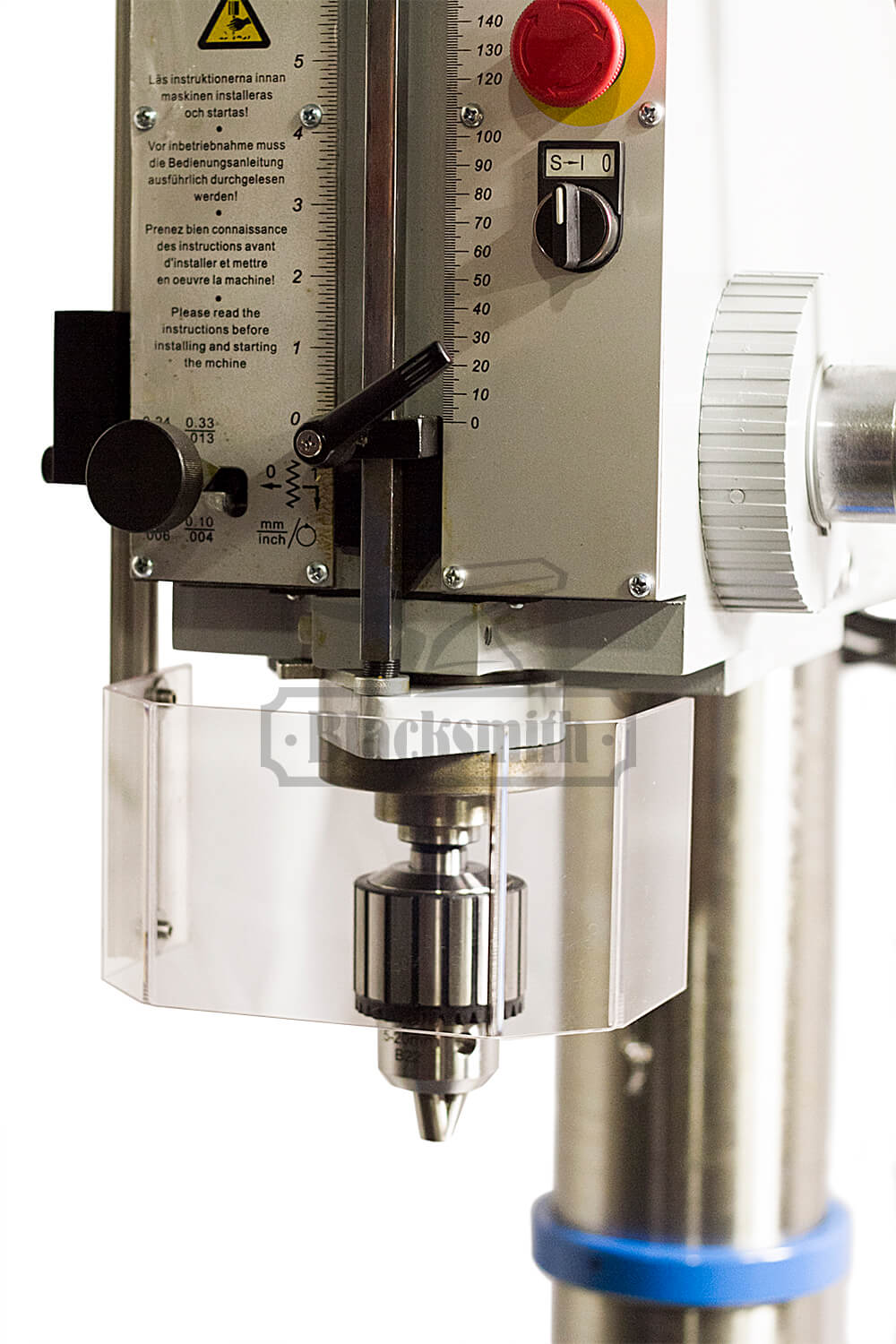 От вылета искр и стружки защищает специальный кожух, которым закрыт сверлильный шпиндель. Для полной быстрой остановки станка предусмотрена кнопка аварийной остановки.