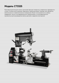 СТ3325, мультифункциональный станок, выполняет функции токарного и сверлильно-фрезерного станка: точение, растачивание, сверление, нарезание резьб. Подходит для обработки металлических и неметаллических материалов. Может использоваться в учебных заведениях, научно-исследовательских лабораториях, на производстве или применяться для производства мелких деталей и изделий в мастерской.