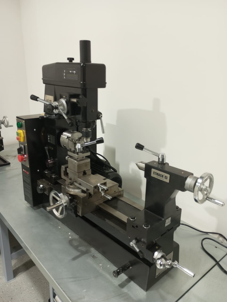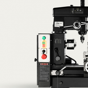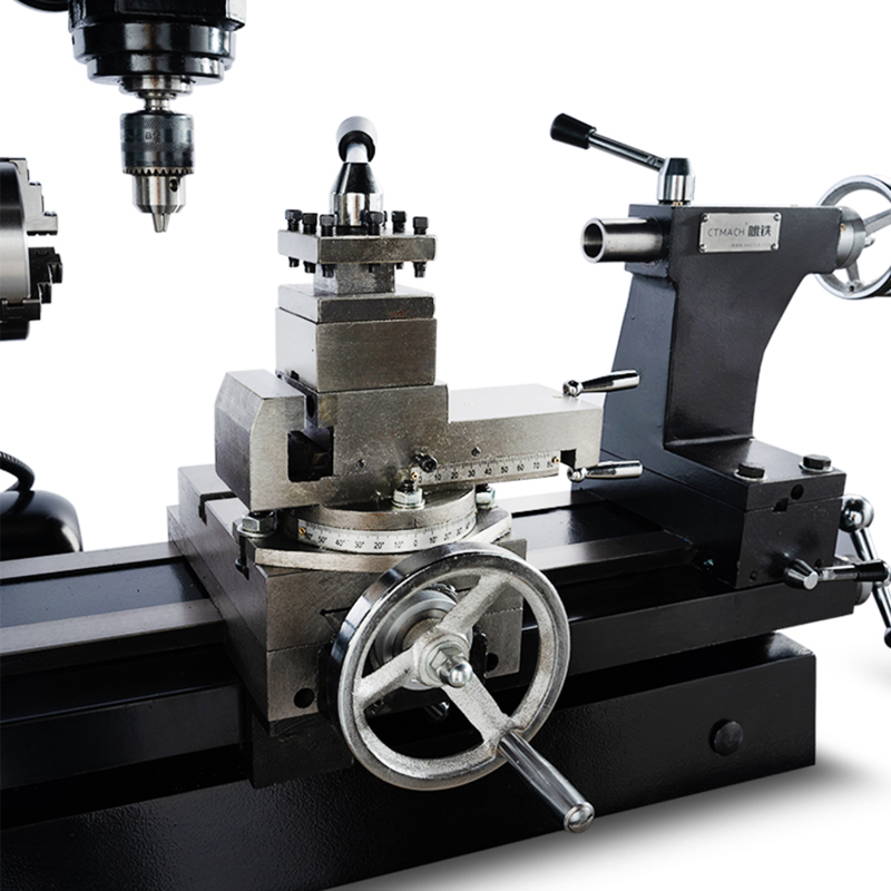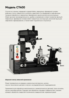 Многофункциональный настольный токарно-фрезерный станок CT400 может фрезеровать, сверлить, шлифовать, нарезать резьбу и обтачивать детали. Он работает быстро и точно, благодаря регулируемому шпинделю и ременному приводу мощностью 0,75 кВт.