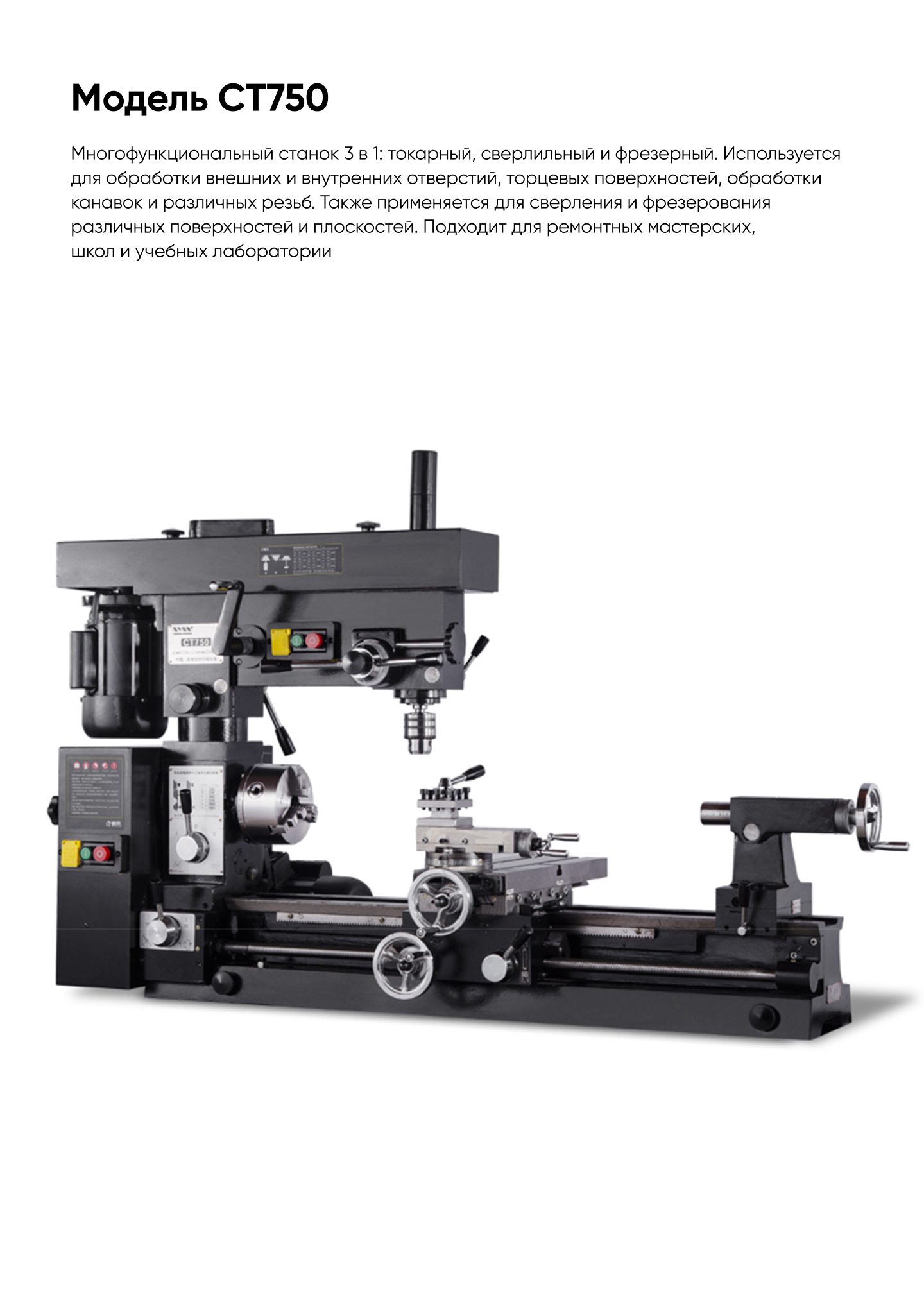 Многофункциональный станок 3 в 1: токарный, сверлильный и фрезерный. Используется для обработки внешних и внутренних отверстий, торцевых поверхностей, обработки канавок и различных резьб. Также применяется для сверления и фрезерования различных поверхностей и плоскостей. Подходит для ремонтных мастерских, школ и учебных лаборатории.
