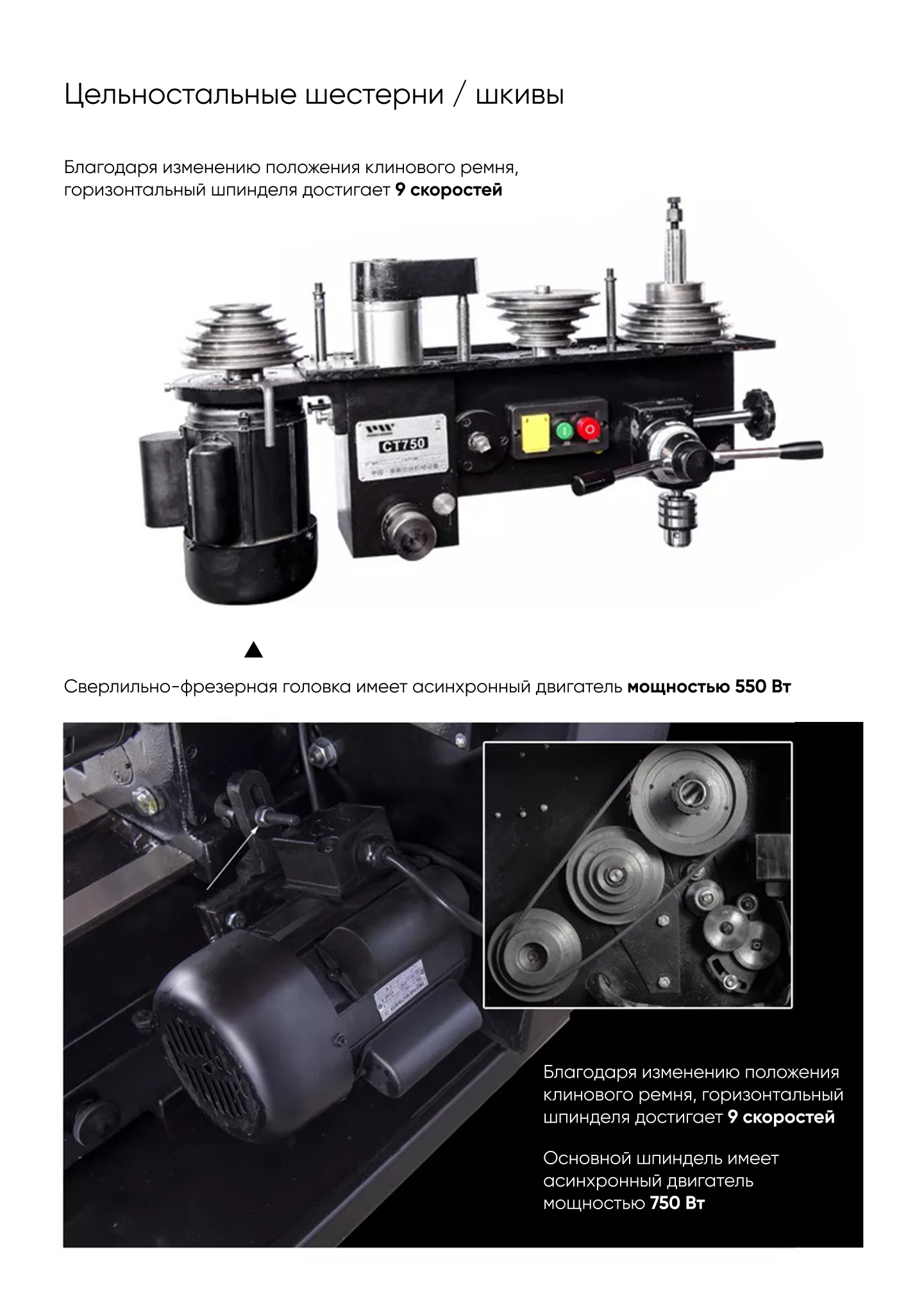 1. Токарные и фрезерные станки используют независимые двигатели для обеспечения мощности, а скорость шпинделя может быть получена с помощью различных положений клинового ремня для получения различных скоростей.
