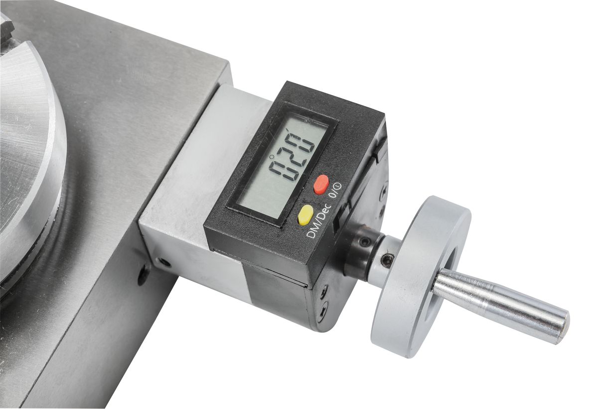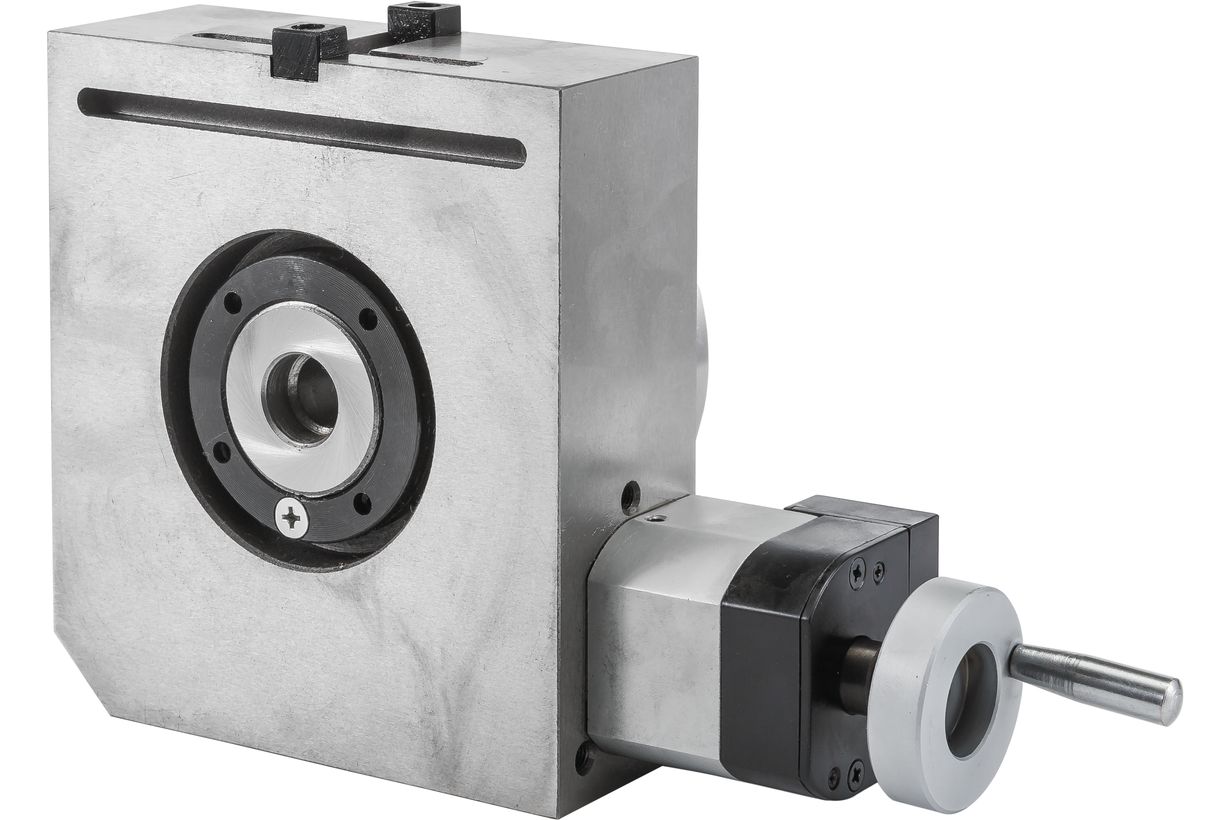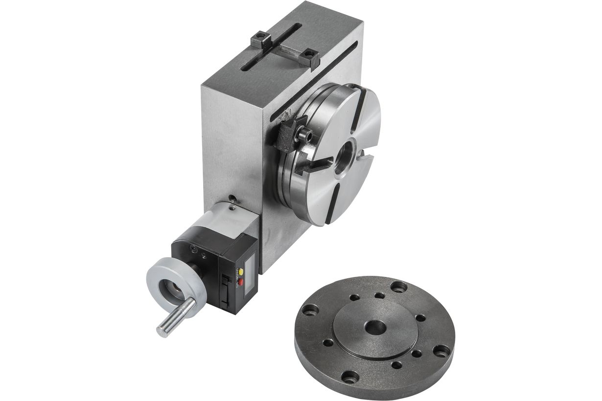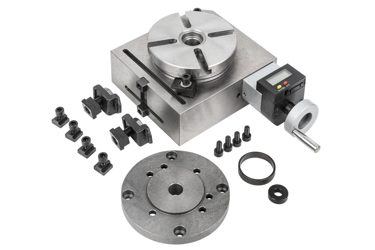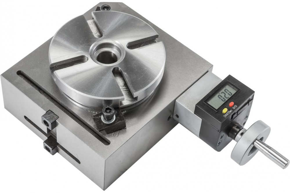 Поворотный стол диаметром 100 мм является одним из вариантов основной оснастки, используемой для обработки деталей и заготовок на фрезерно-сверлильных станках модели JMD-1, JMD-X1, JMD-1L, JMD-2, JUM-X2, JMD-16A, JMD- 20LA и JMD-20LA DRO. Стол имеет поворотный механизм, обеспечивающий круговое вращение на 360° вокруг оси стола. Приспособление обладает техническими возможностями для позиционирования обрабатываемой детали в широком диапазоне, как в горизонтальном, так и в вертикальном положении. Поворотный стол имеет центральной отверстие с конусом МТ2 и Т-образные углубления для установки прихватов.